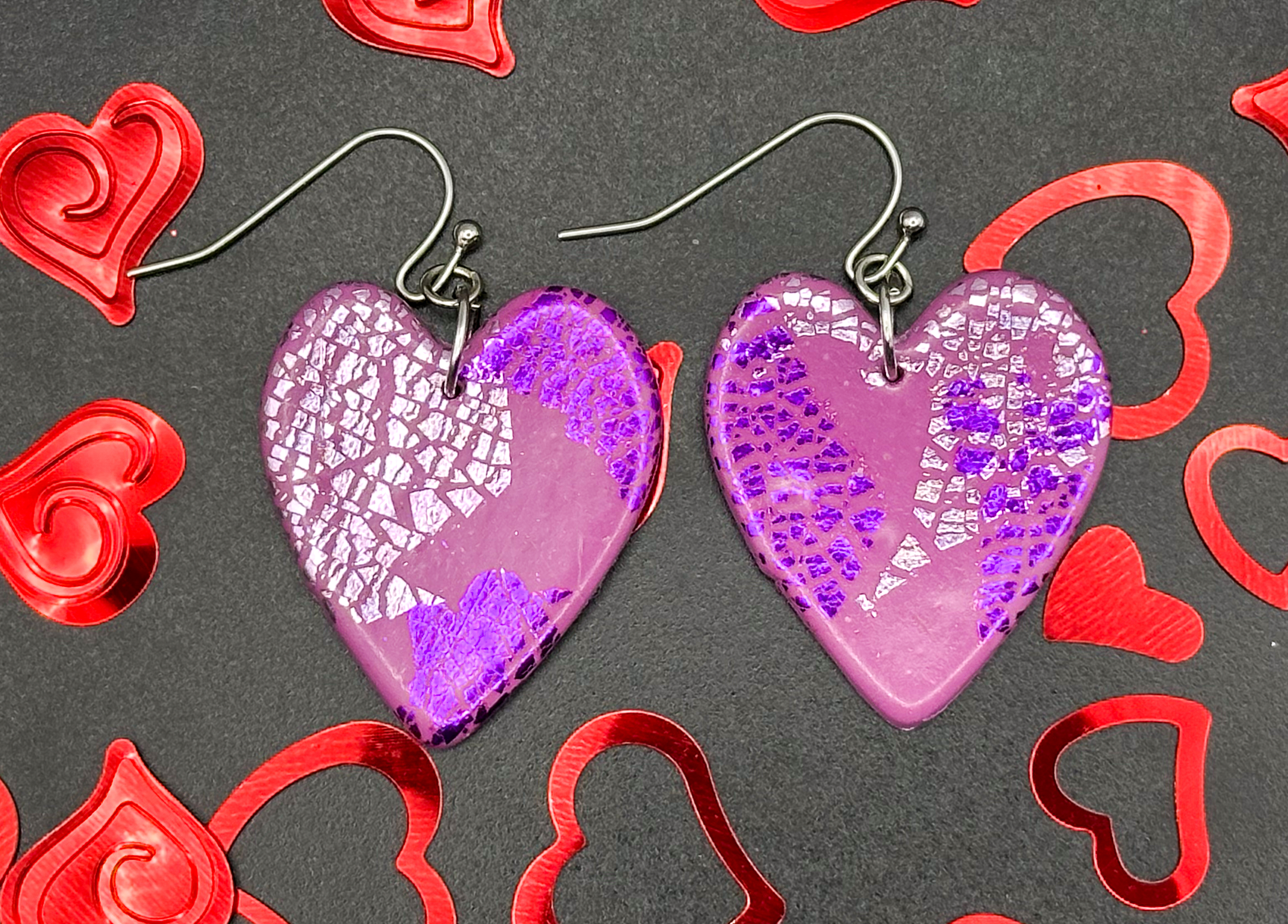 Rich purple hearts with shimmering foil accents—these earrings are bold, elegant, and perfect for making a statement!