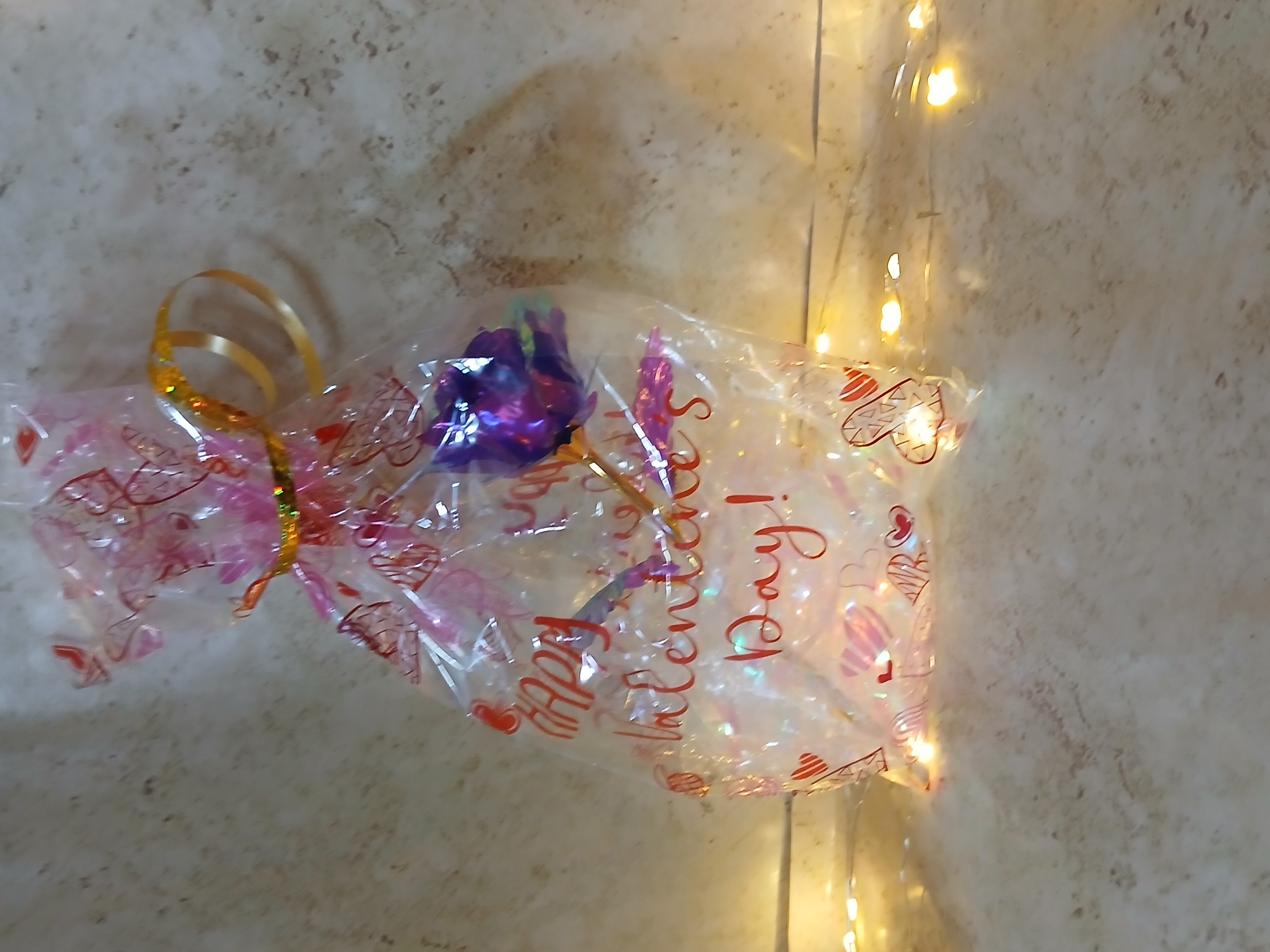This rose is known by forever rose or galaxy roses is purple in color and is in a plastic treat bag that says Happy Valentines day and has iridescent shreds on the bottom and gold curling ribbon to top it off