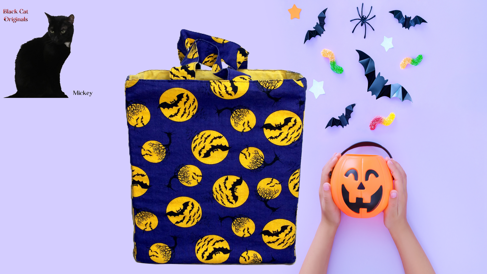 This is a small tote with a fun Halloween theme! The body and handle of the bag is 100% cotton. and measures 11 inches tall by 9 inches wide and 4 inches deep. Just the right size for a night's worth of trick or treating. It's reusable, too! Machine wash/dry. Linings and handles vary.