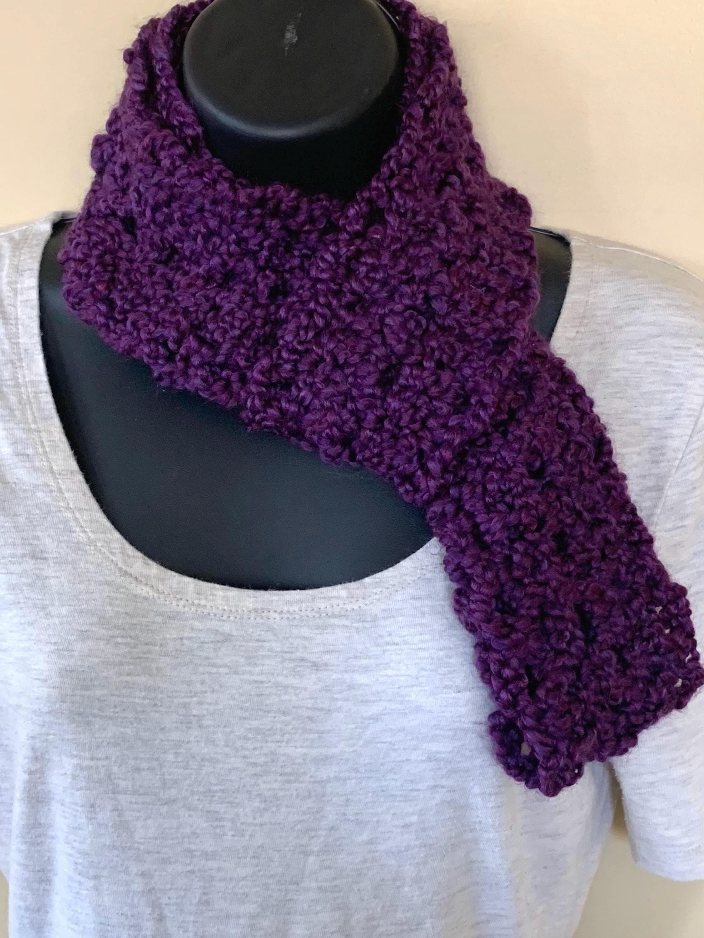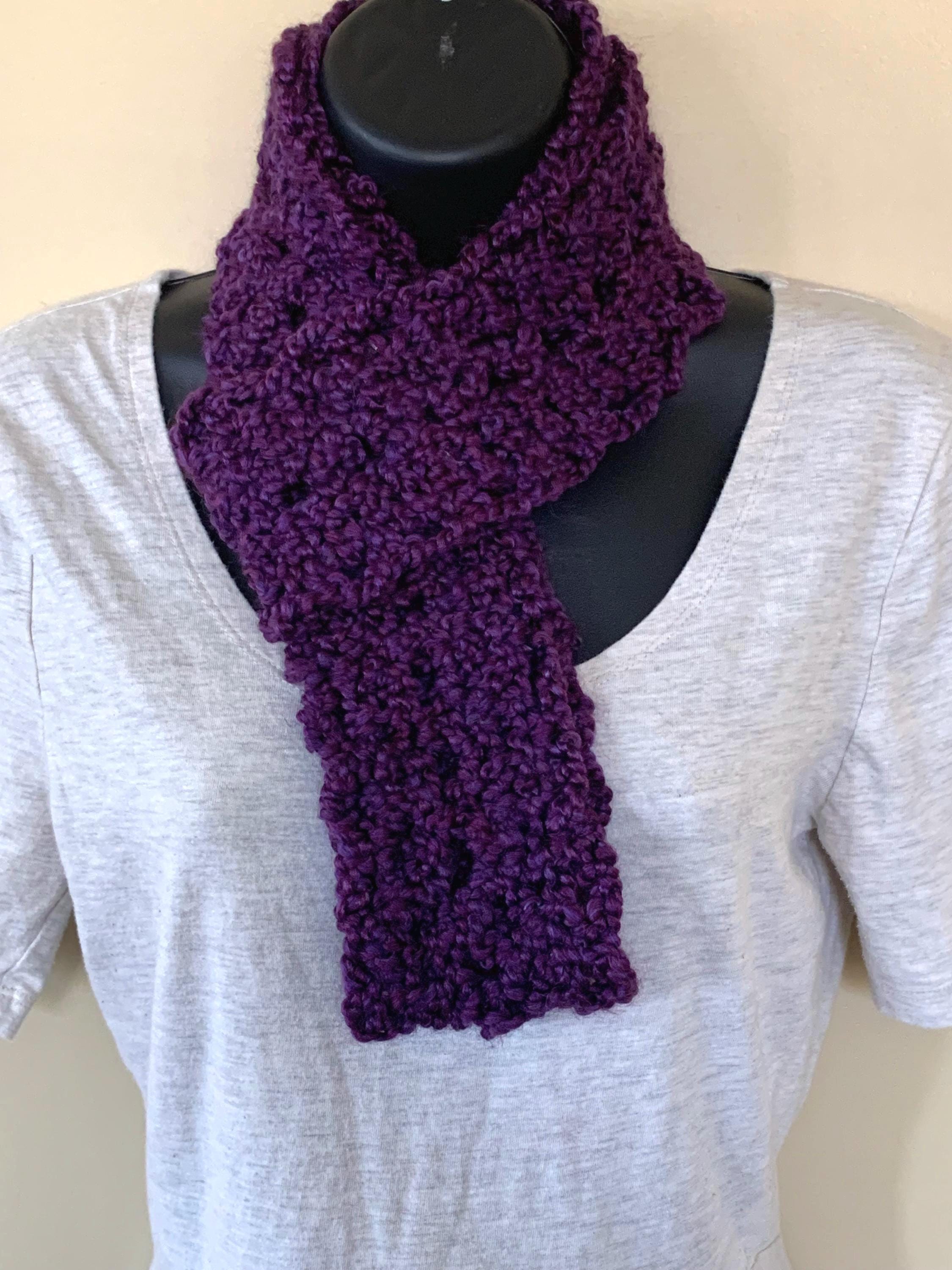 I used popular Grape Lion Brand Homespun Yarn. It is no longer made, so it is hard to find. It is is an acrylic and polyester blended synthetic yarn that is soft and warm.