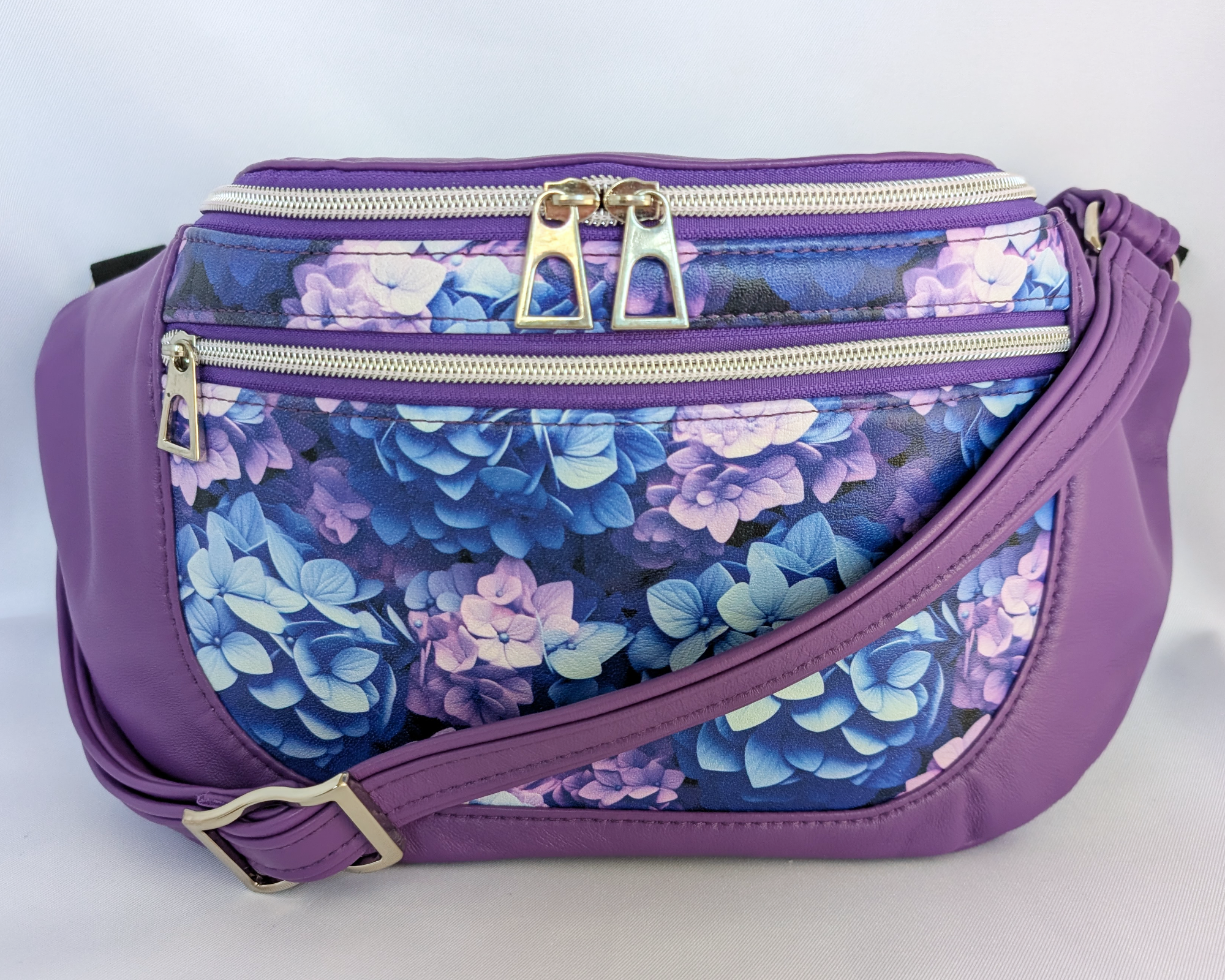 Soft, supple leather and a beautiful Hydrangea print on the the front pocket make this bag special. Inside, there are six credit cards slots with a zipper pocket above and plenty of room for a wallet, keys, and other valuables. On the back is another large zipper pocket. The matching leather strap adjusts from 34" to 46". Wear it as a crossbody to have your hands free. The bag measures 14" wide by 8" tall and 4.5" deep at it's widest point. It's fully lined with durable waterproof canvas and has silver hardware.