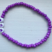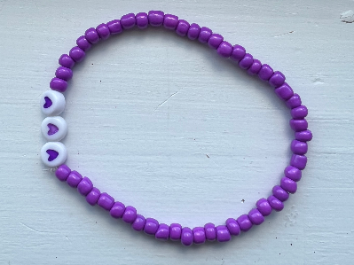 This Purple Love Bracelet features 3 heart beads surrounded by seed beads. It measures approximately 7 inches and is made on stretchy cord.