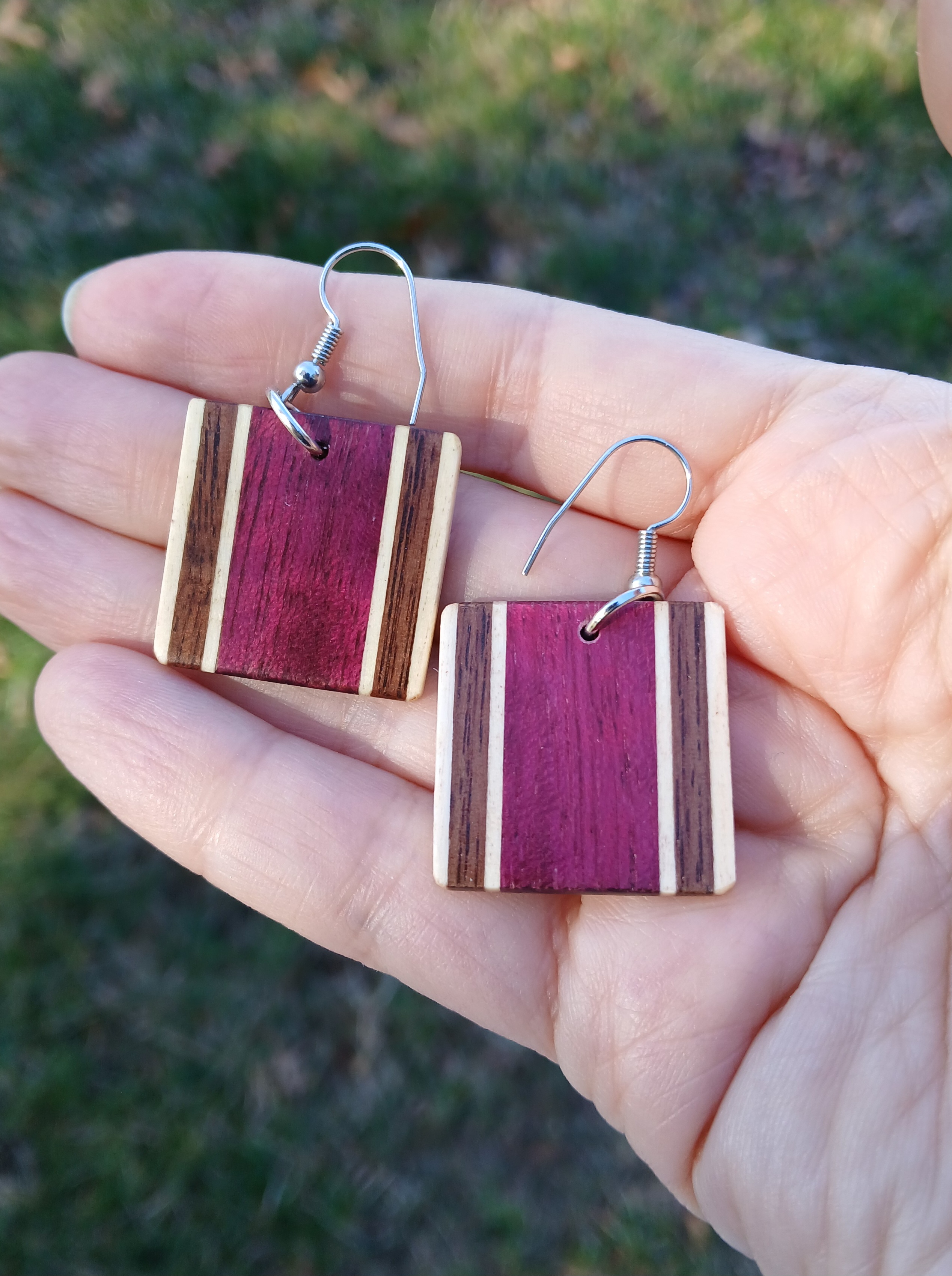 Square tile-shaped earrings made of stripes of Purpleheart, Walnut and Maple. This is naturally colored wood, no stain was used. Satin finish varnish, surgical steel french hooks. 1.75 inches (45mm) long from the top of the hook.