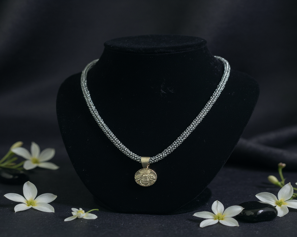 Bees symbolize strength, leadership, and harmony. Whether you’re the queen of your own hive or gifting someone who keeps things buzzing, this necklace is a reminder of inner power wrapped in artisan elegance. A bold tribute to resilience, community, and the beauty of nature, this necklace features a tightly woven beaded rope in smoky gray glass, crowned with an antique silver-tone bee medallion that evokes vintage coin charm and quiet authority.