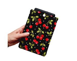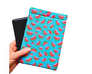 Kindle sleeve with snap to protect Kindle e-readers made with a pink back ground with red and white strawberries.