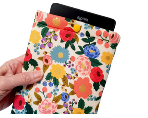Five colorful, floral Kindle Sleeves to hold and protect Kindles. Made with Rifle Paper Co. fabric.