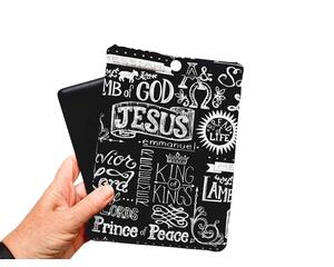 A pouch with a snap closure to protect Kindle e-readers made with black with gold metallic stars fabric.