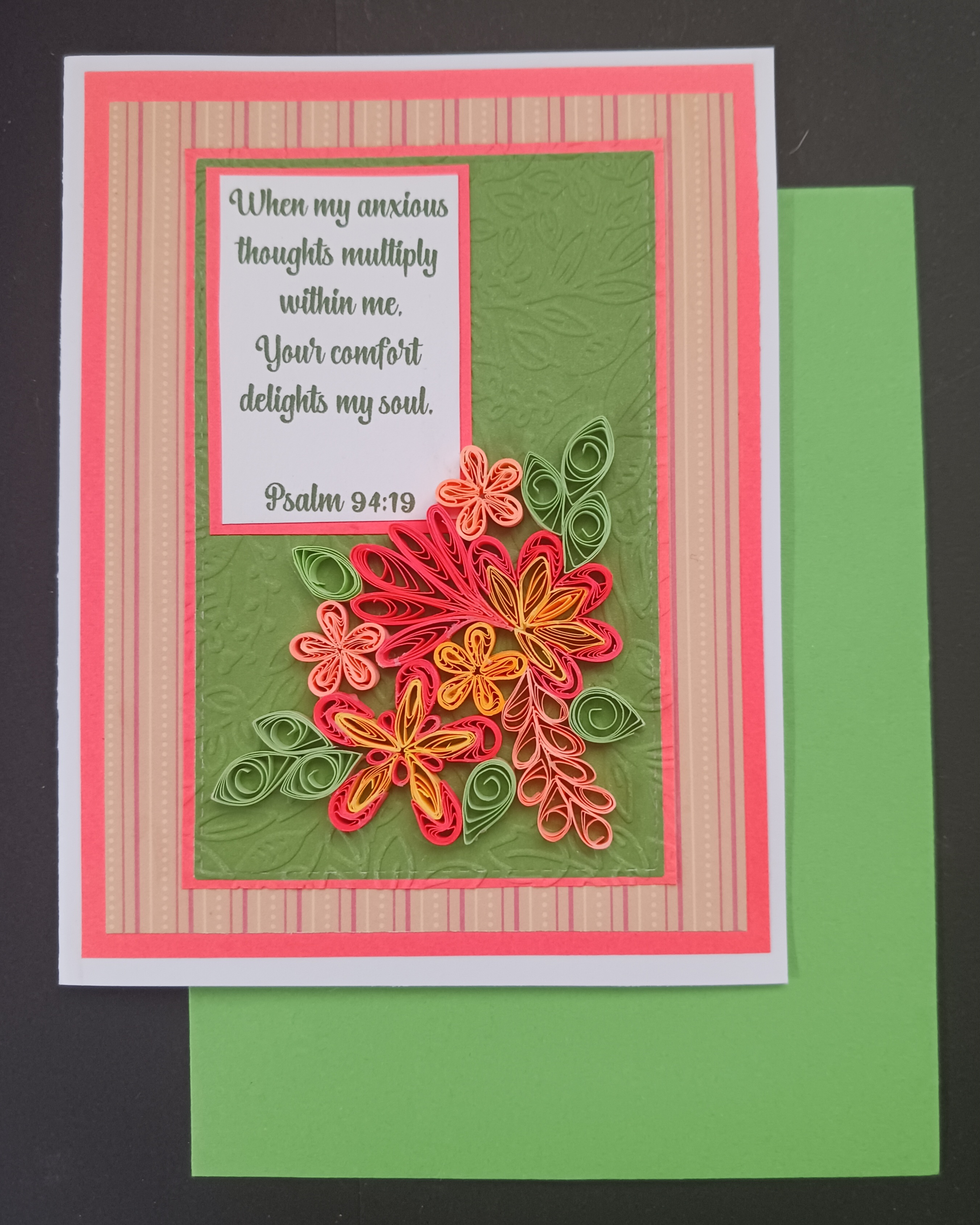 This is a handmade card, with die cut and quilled embellishments.. The card features a Bible verse on the front, and is blank in the center. Quilling, or paper filigree, is an art that has been done for centuries by many different cultures. Thin strips of paper are rolled into intricate designs to produce a stunning and unique card that your friends will be sure to appreciate and keep. They are also suitable for framing. Cards are made with 1/8" quilling , so they can be mailed like a regular card, no padding necessary.