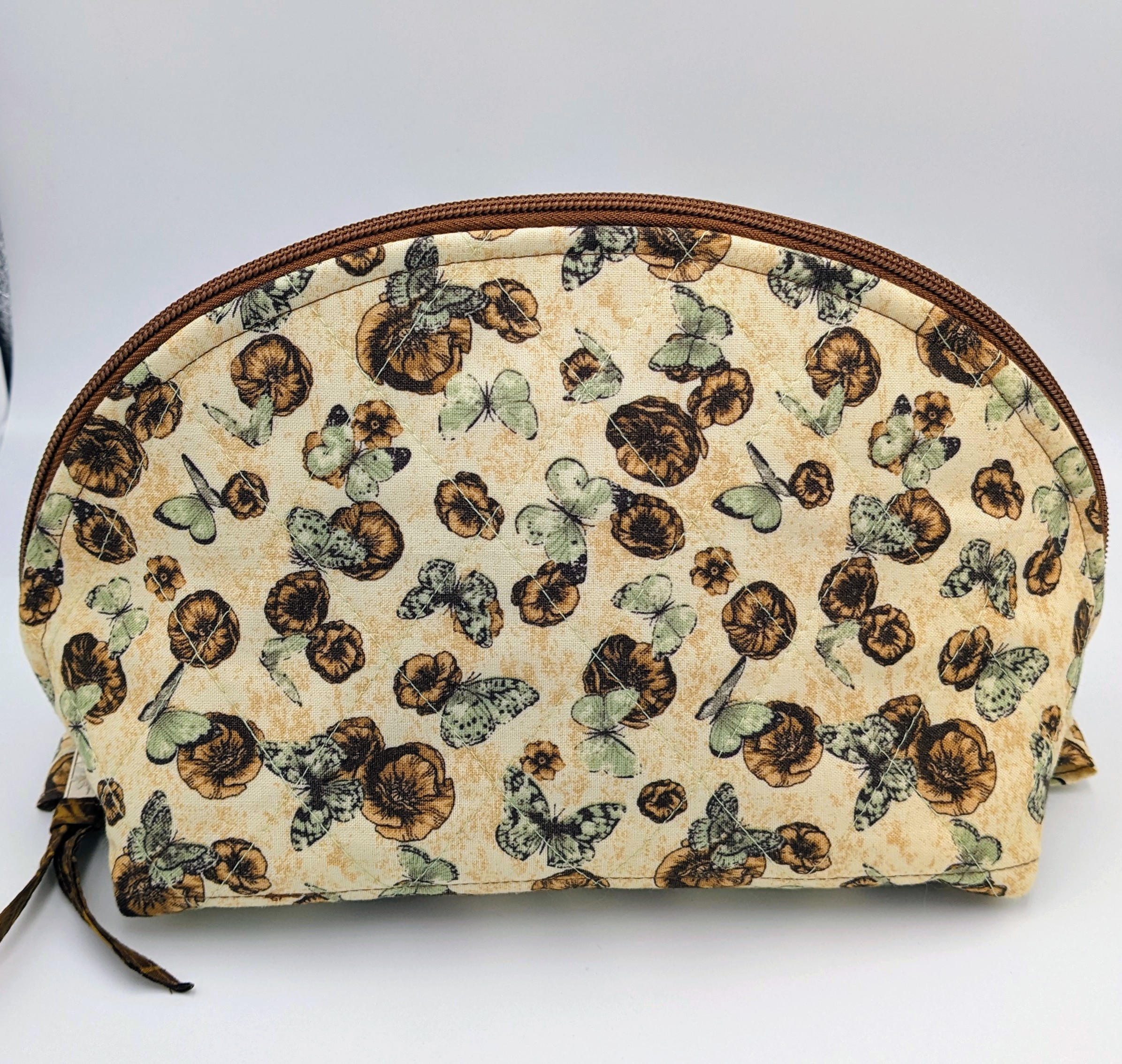 This extra large quilted zipper pouch has been made in a cotton fabric of coffee colored flowers and sage green butterflies on a beige mottled background. The lining is a bronze, rust coordinated batik print.