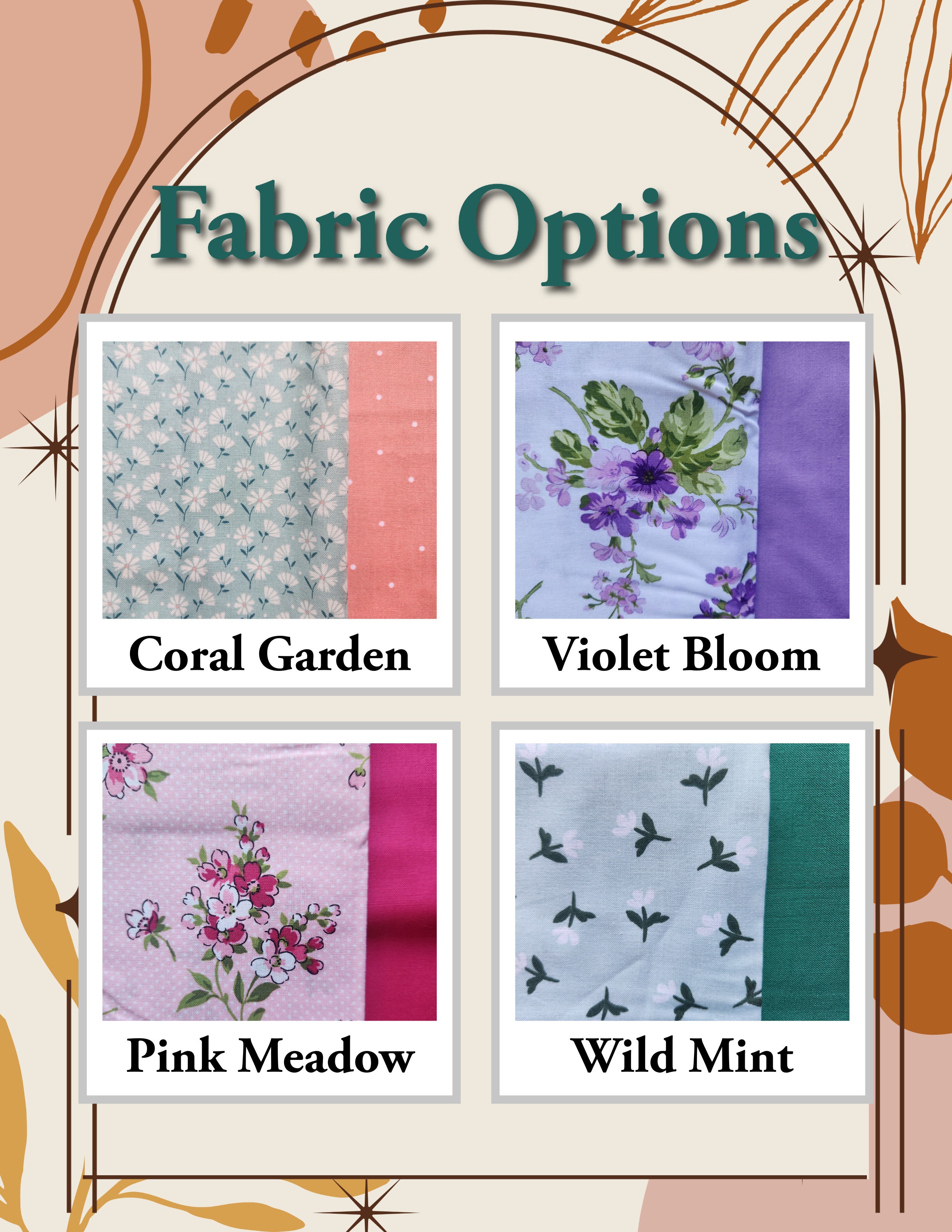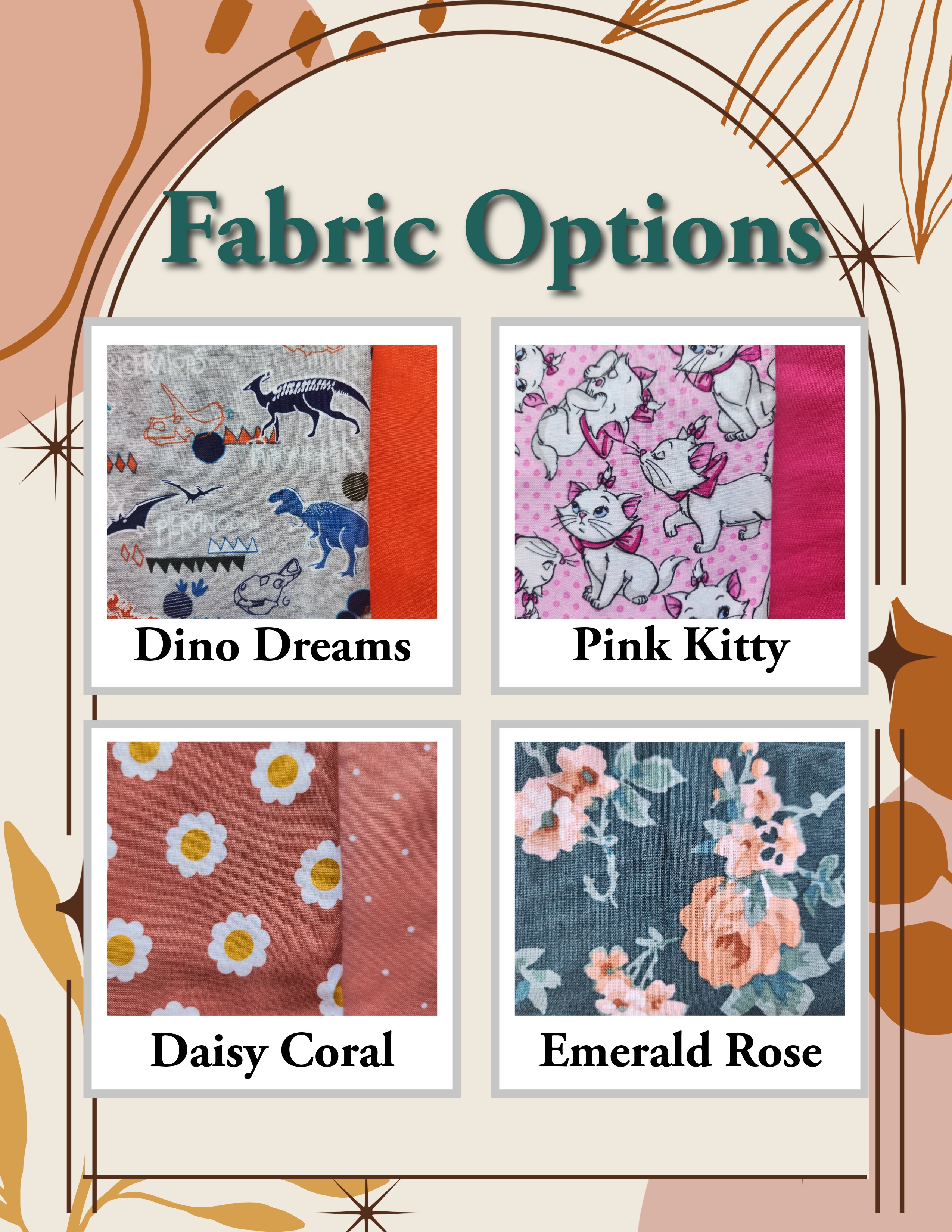 • Beautiful fabric designs — floral, pastel, cartoon characters and custom options!