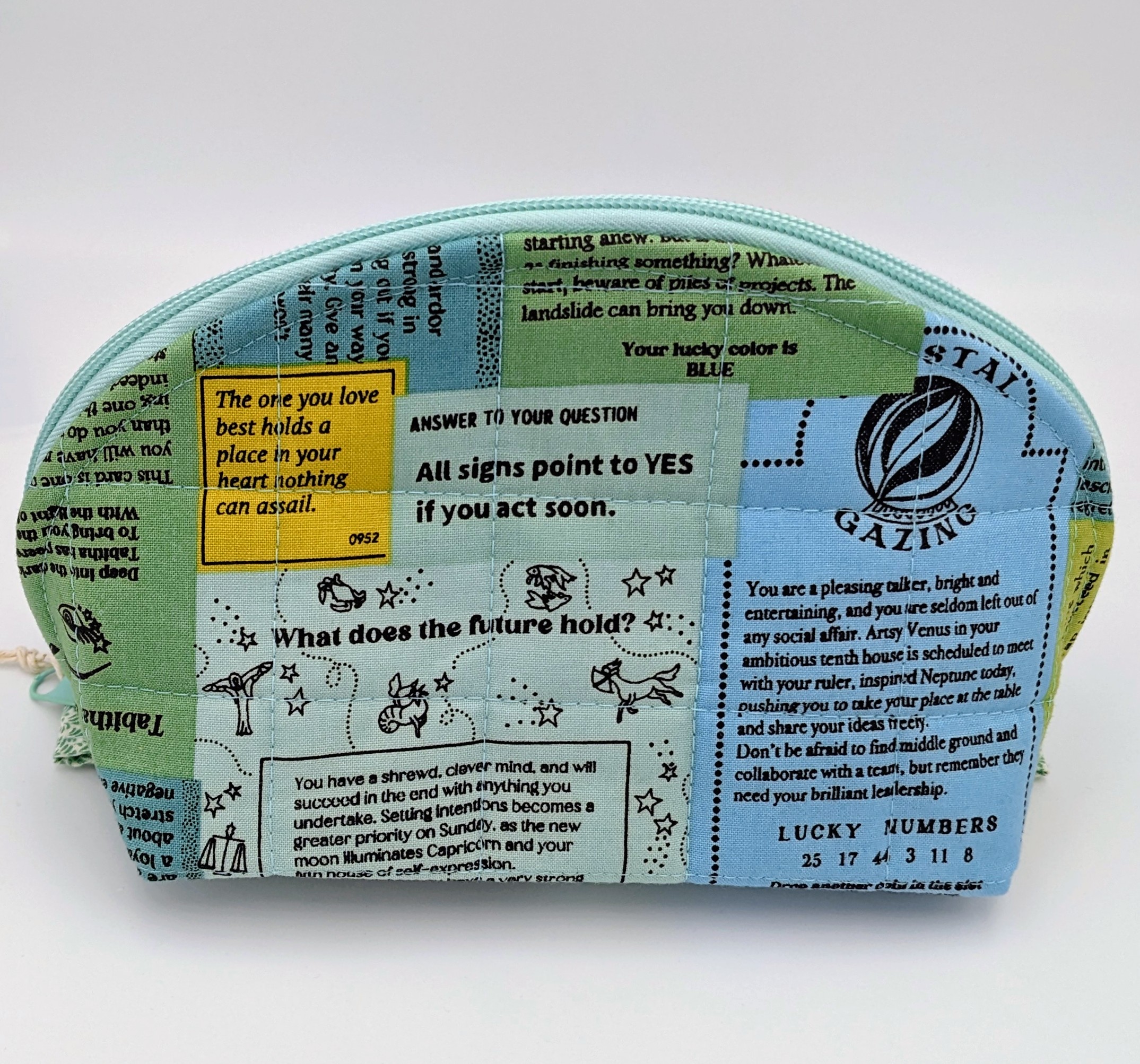 This large quilted zipper pouch was made in a metaphysical sayings cotton fabric of light blue, turquoise and pale green. The lining is a pale turquoise solid cotton.