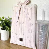 This charming quilted zipper pouch features fabric showcasing a delicate floral print with a soft pink background and feminine ruffle details that add a touch of vintage-inspired elegance to your everyday carry. Perfect for organizing makeup, pens, small tech accessories, or other daily essentials.