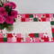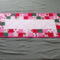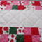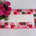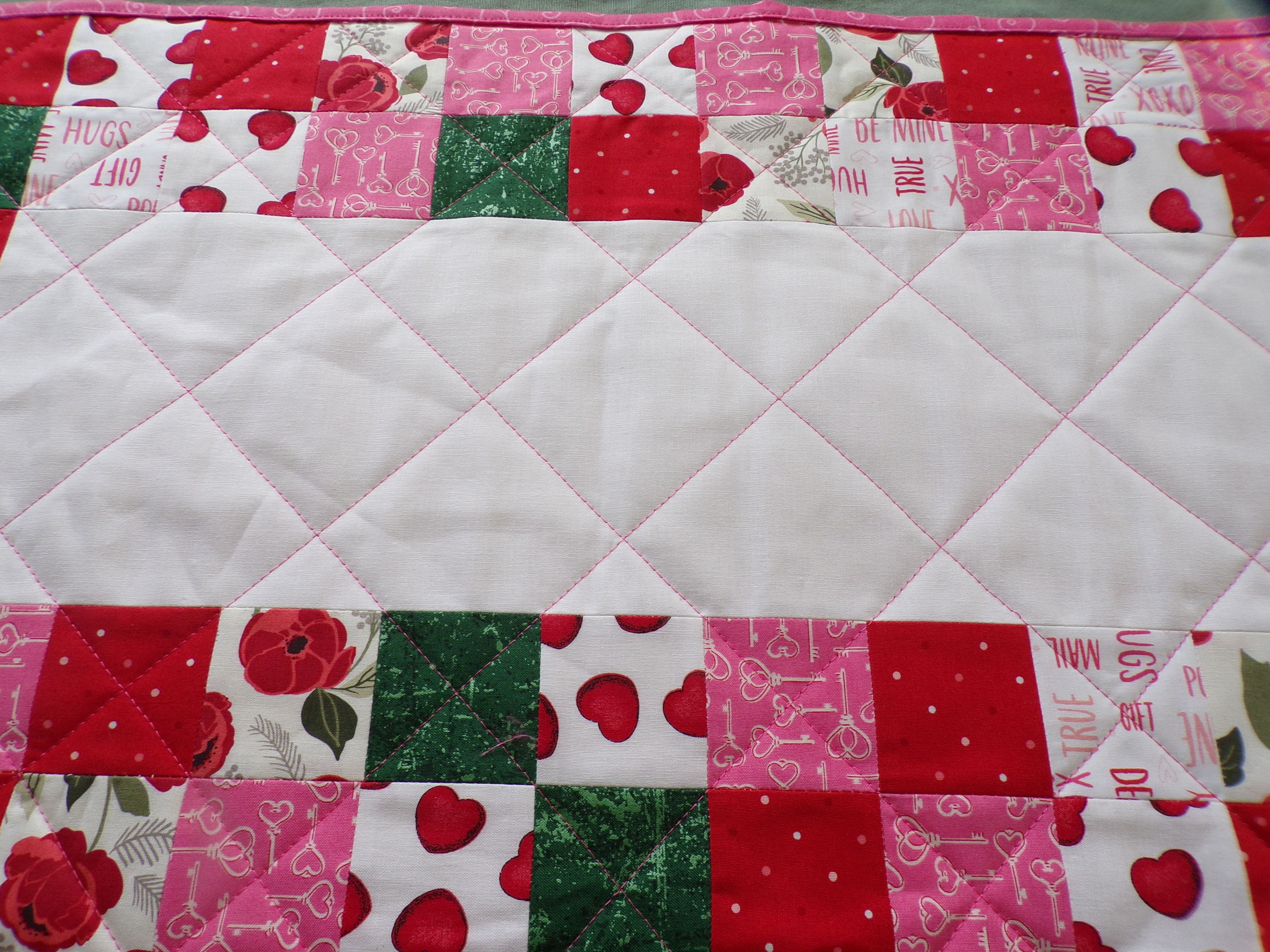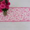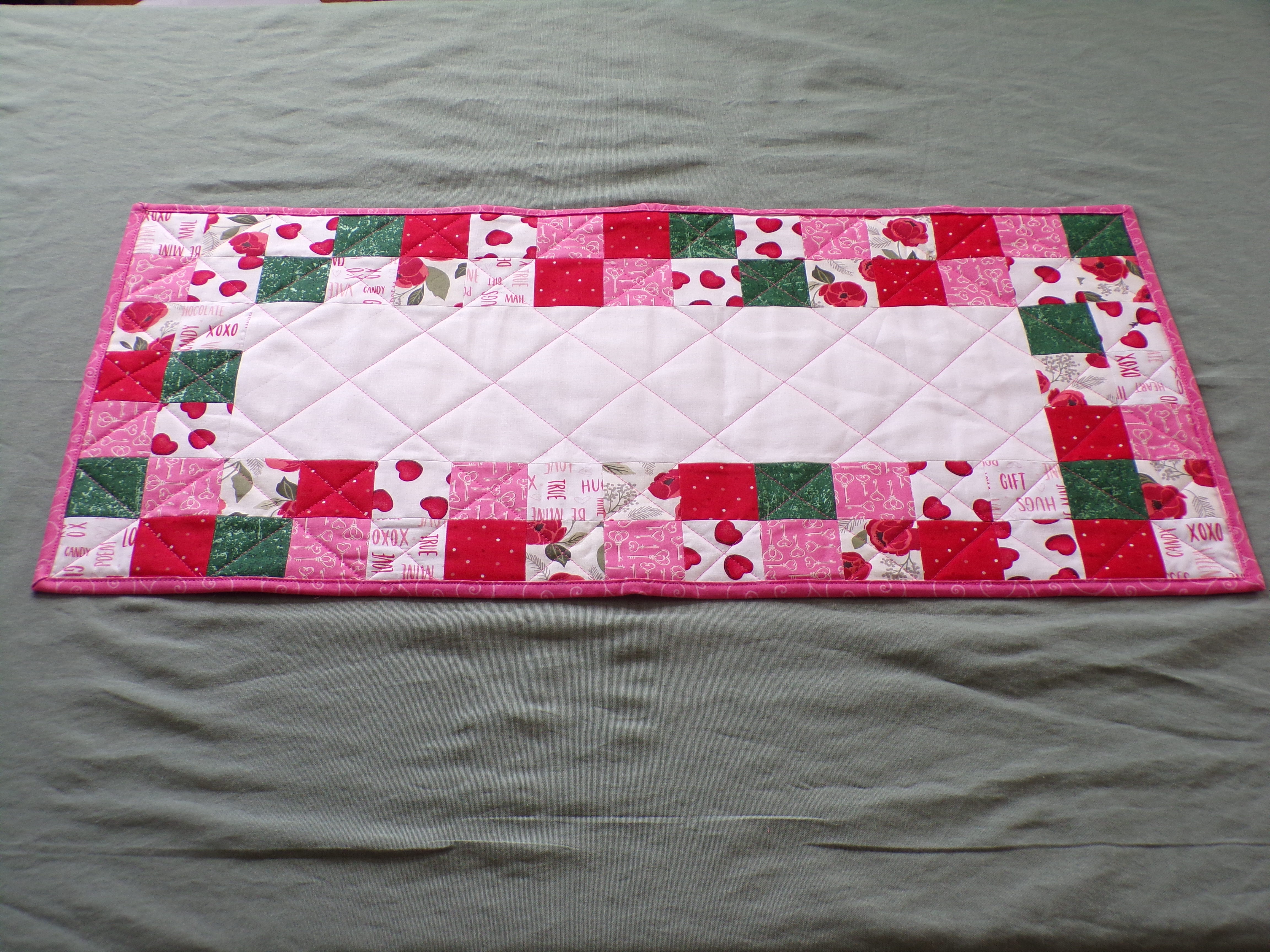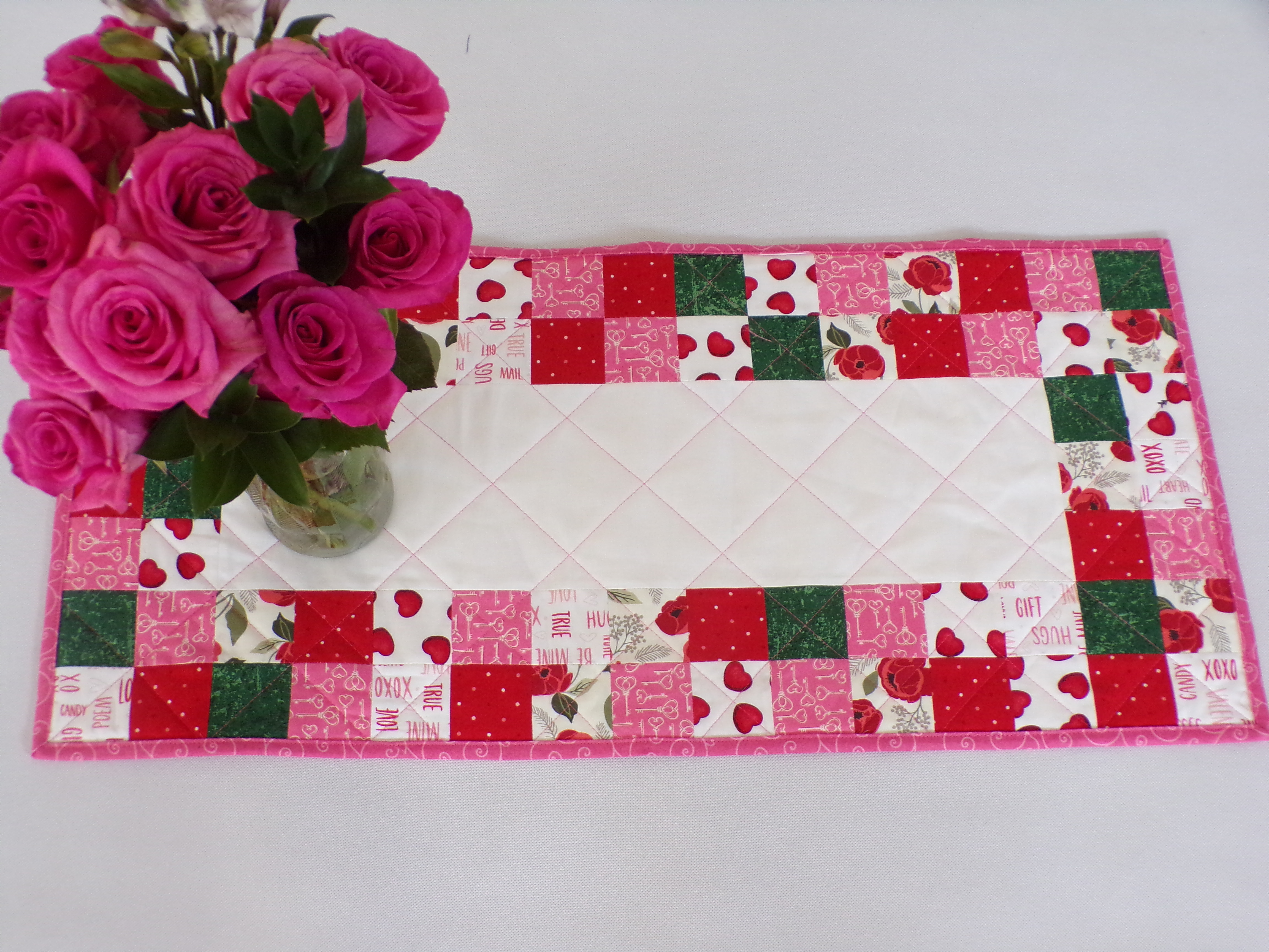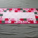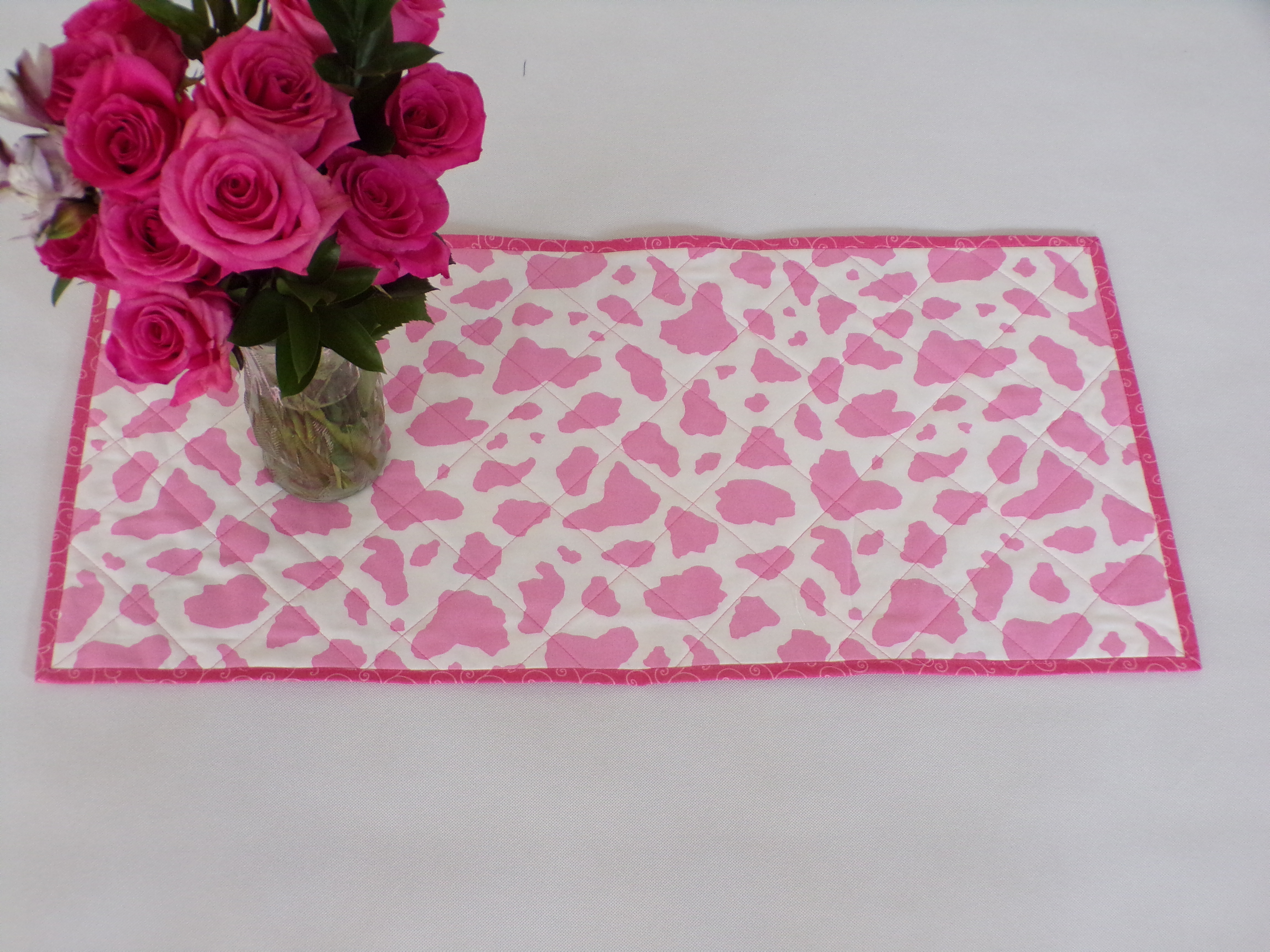 Scrappy Valentine's Day themed table runner is 14 inches wide and 30 inches long. Table runner is quilted with dark pink thread and bound with pink fabric. Back is a pink cow print design. Fabrics are cotton. Machine wash cold water, gentle cycle, mild detergent, and a color catcher. Dry on low setting or line dry.