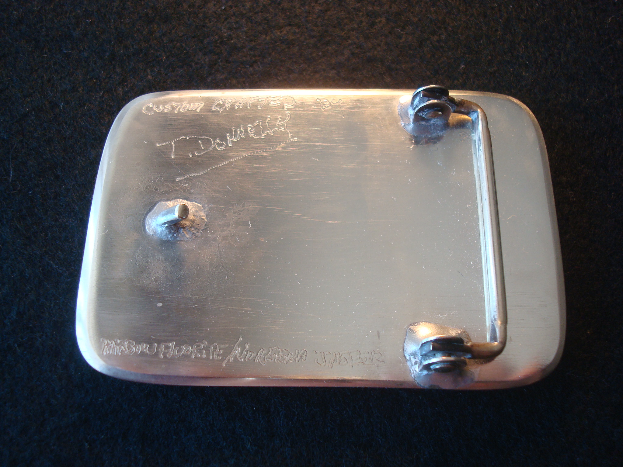 I have been making my buckles for approximately 45 years. I cut shape and polish all my pieces and fabricate my belt buckle backings using German silver or as it's also called nickle silver. German silver is not silver but an alloy comprised of nickle,brass, and zinc and I use it because it is stronger,less expensive and it doesn't tarnish as does silver. All my buckles take around 20 different steps to complete and the one's with silver insets take many more steps.