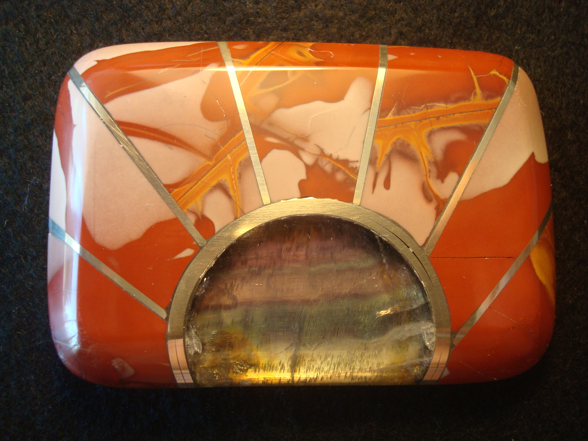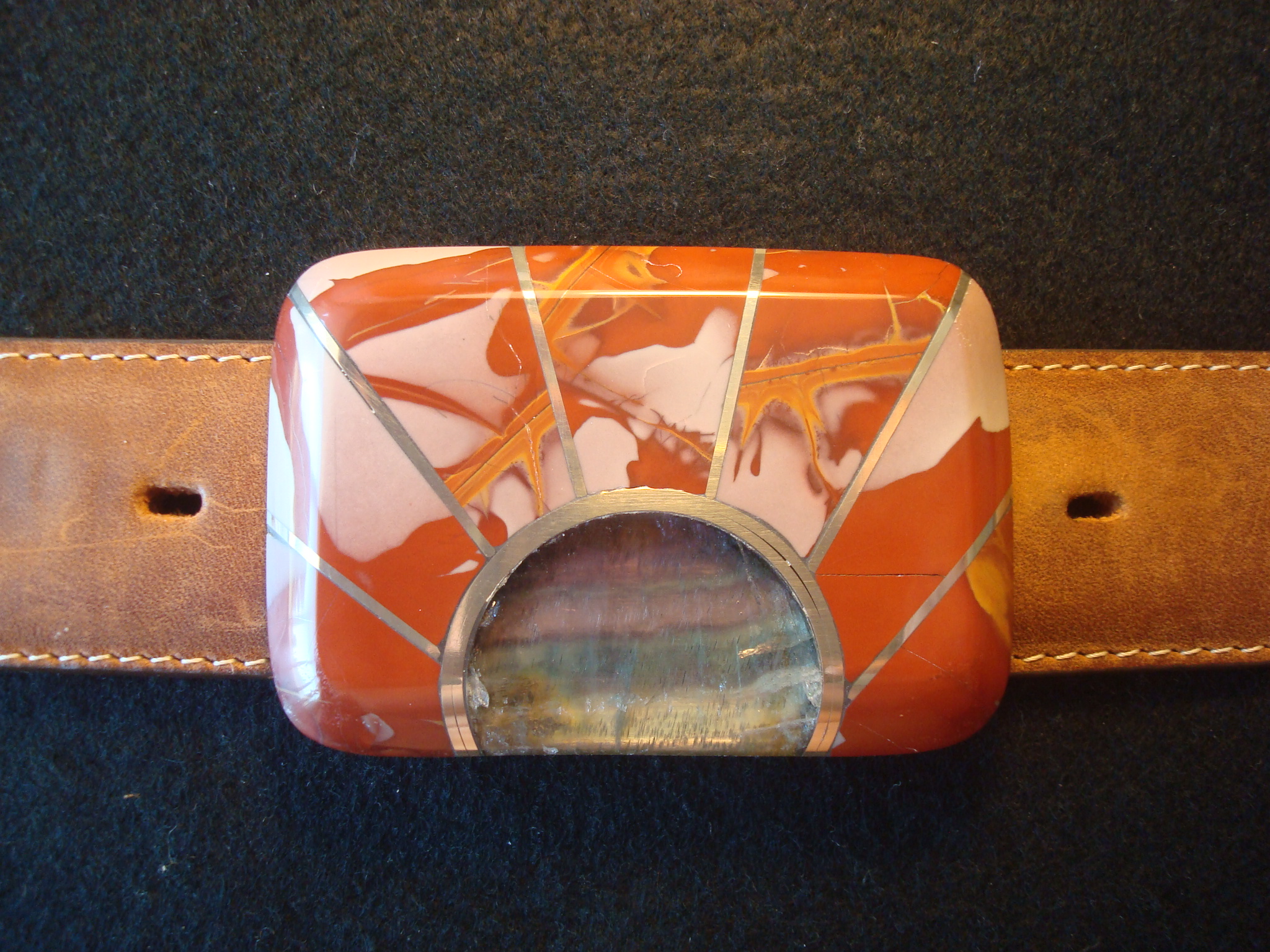 I have fashioned this piece from Noreena Jasper which is found in the Pilbara region of western australia and a stone called rainbow florite. I have inset pieces of silver between the eight different pieces to enhance and seperate the pieces . This buckle is formed in my beveled edge design and is supported with my handmade silver backing, The backing is signed and dated along with the stones name .This buckle will accept a belt up to 1 1/2" in width and it measures 2 1/6" by 3 1/16"and is approx. 1/4" in thickness. Note that German silver is not silver but an alloy comprised of nickle,brass and zinc. The reasons that I use it is because it is stronger, less expensive and it doesn't tarnish as does silver.