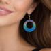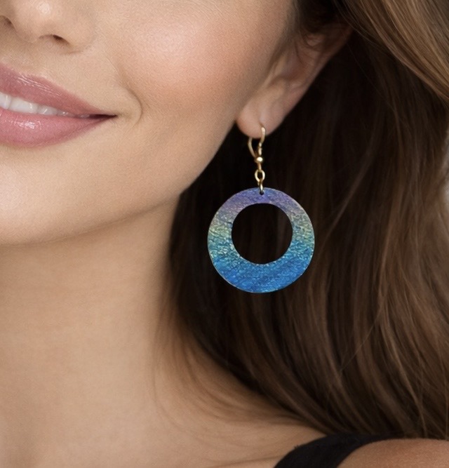 Add a pop of color to your outfit with these unique rainbow hoop earrings. Featuring a blend of blue, yellow, and purple hues, these earrings are sure to catch the eye. These larger but very lightweight hoop earrings are made of a wood base with a faux leather surface, covered with glossy resin…making them comfortable to wear all day long. Very colorful — and will match many outfits.