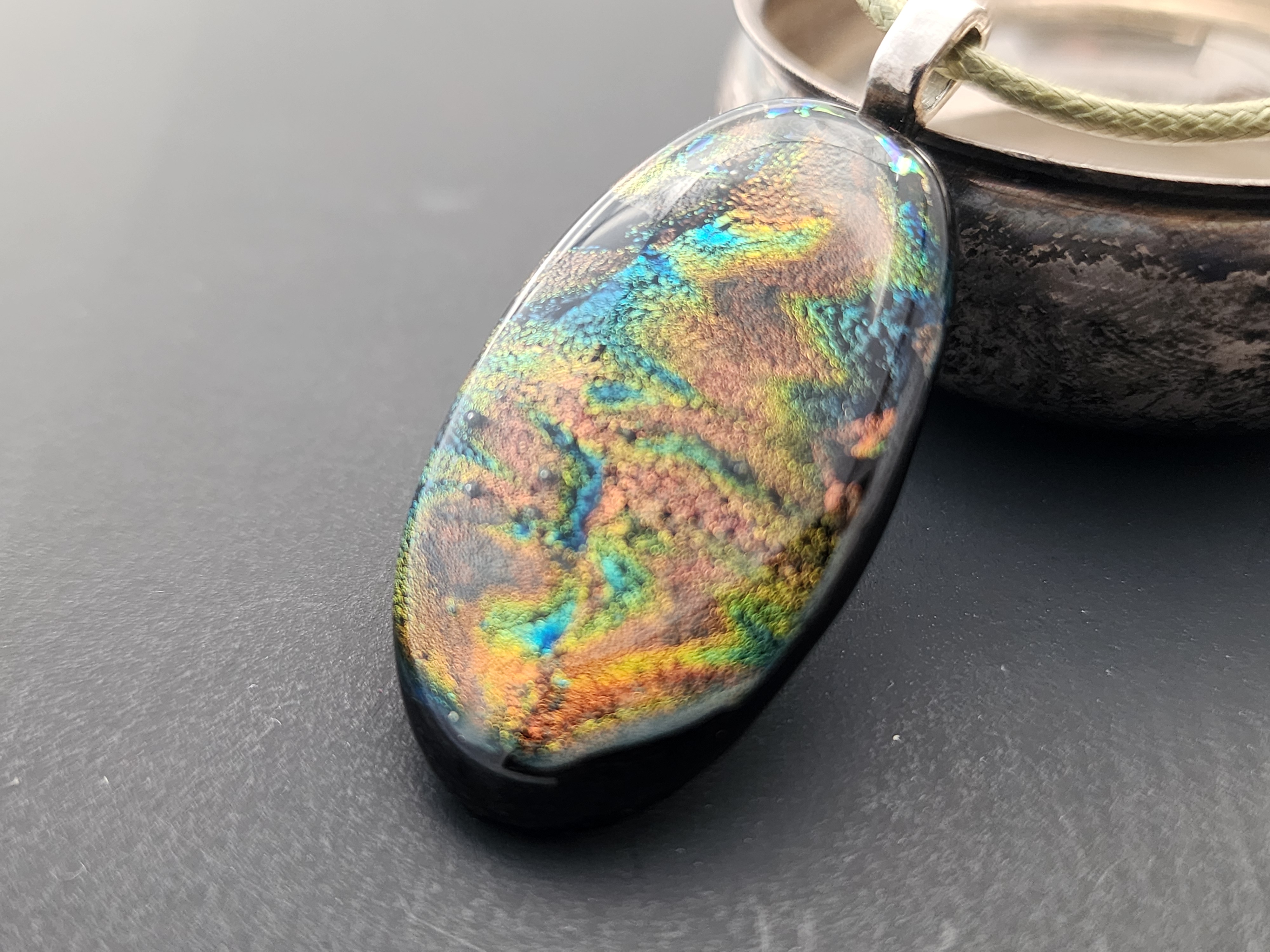 With swirling, colorful sparkles that remind you of the vast universe, this fused glass pendant is handmade in my studio using upcycled rainbow dichroic glass on a black base. TCAG pendants are thoughtful and unique gifts for all your gift-giving needs: Grandma, Favorite Teachers, Coworkers and more. I've made it even easier for you by including a gift tag, bow, and jewelry box.