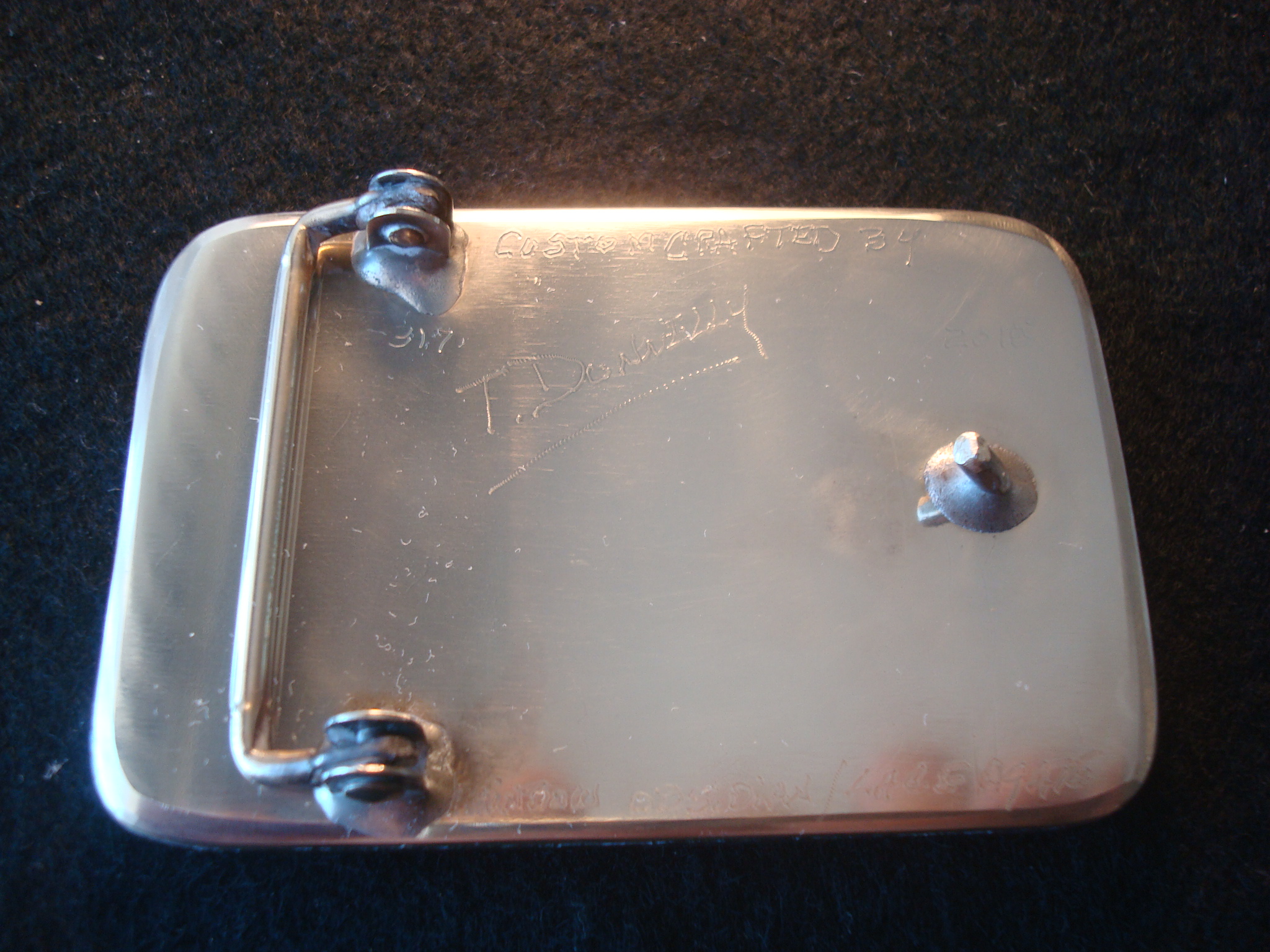 I have been making my buckles for approximately 45 years. I cut shape and polish all my pieces and fabricate my belt buckle backings using German silver or as it's also called nickle silver. German silver is not silver but an alloy comprised of nickle,brass, and zinc and I use it because it is stronger,less expensive and it doesn't tarnish as does silver. All my buckles take around 20 different steps to complete and the one's with silver insets take many more steps.