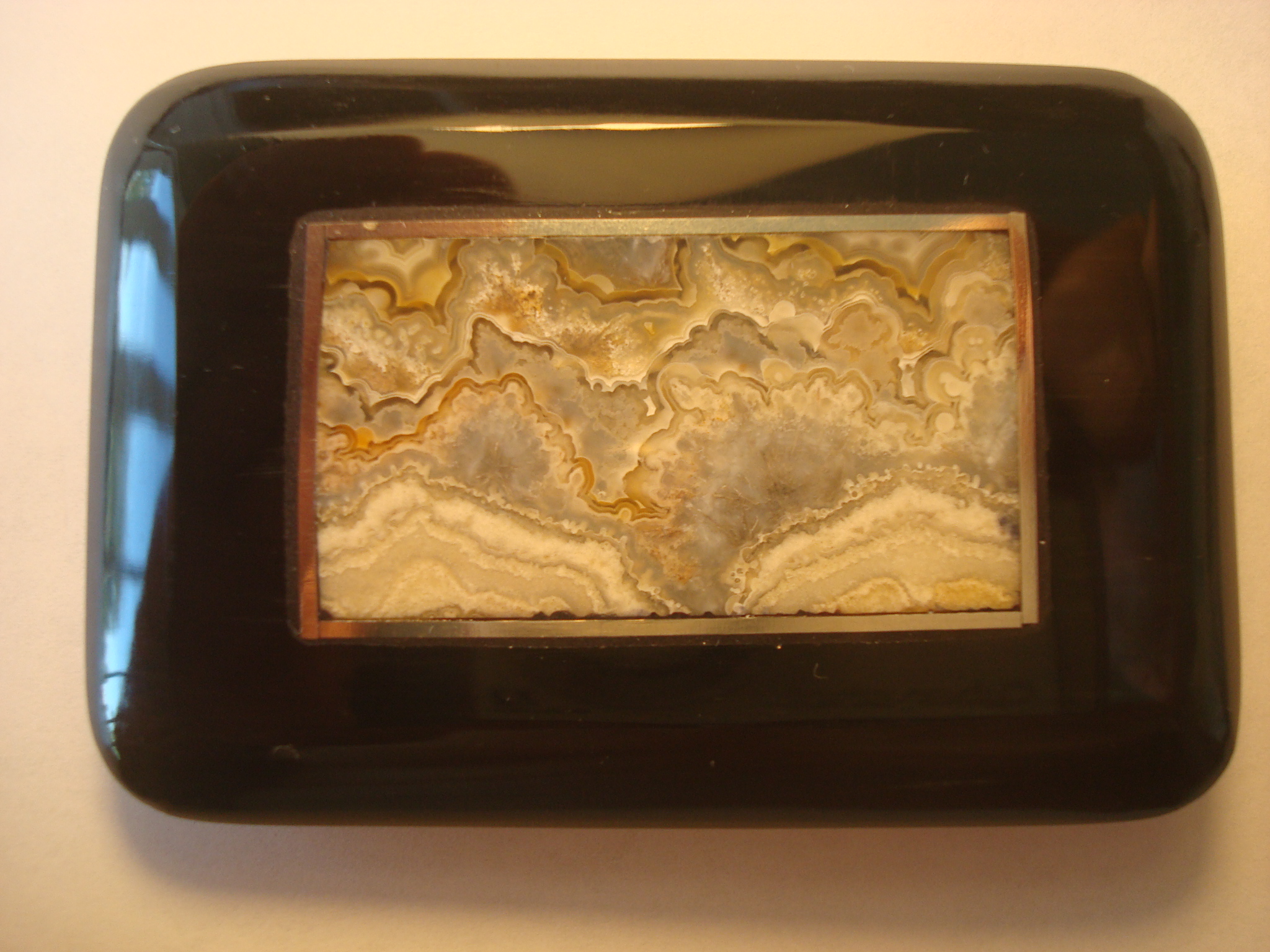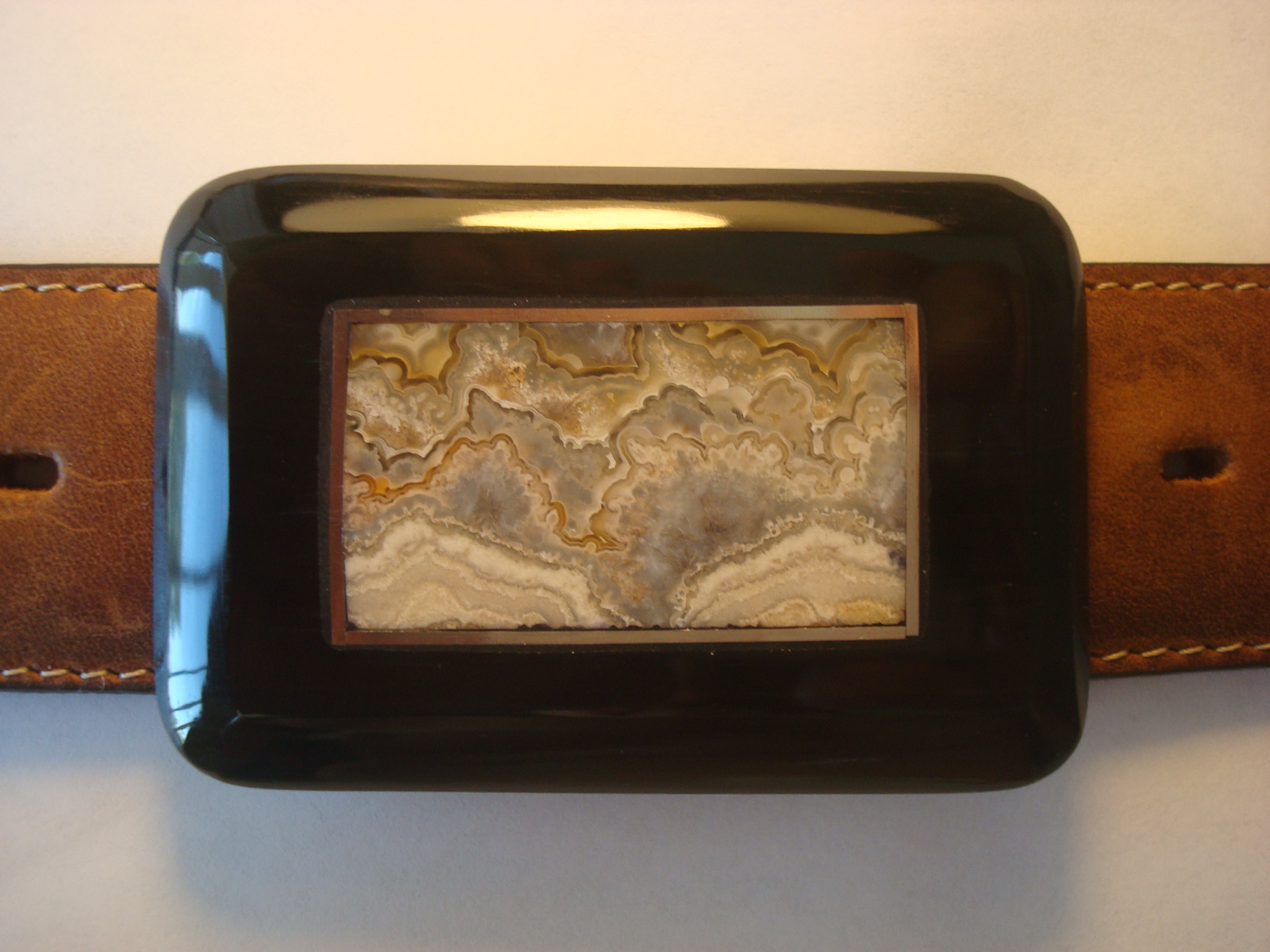 I have created this piece using Rainbow Obsidian and Lace Agate. I have inset a silver frame around the Lace Agate center piece to really showcase this beautiful piece of lace agate.. This buckle is formed in my beveled edge design and is supported with my handmade silver backing, The backing is signed and dated along with the stones names .This buckle will accept a belt up to 1 1/2" in width and it measures 2" by 3"and is approx. 1/4" in thickness. Note that German silver is not silver but an alloy comprised of nickle,brass and zinc. The reasons that I use it is because it is stronger, less expensive and it doesn't tarnish as does silver.