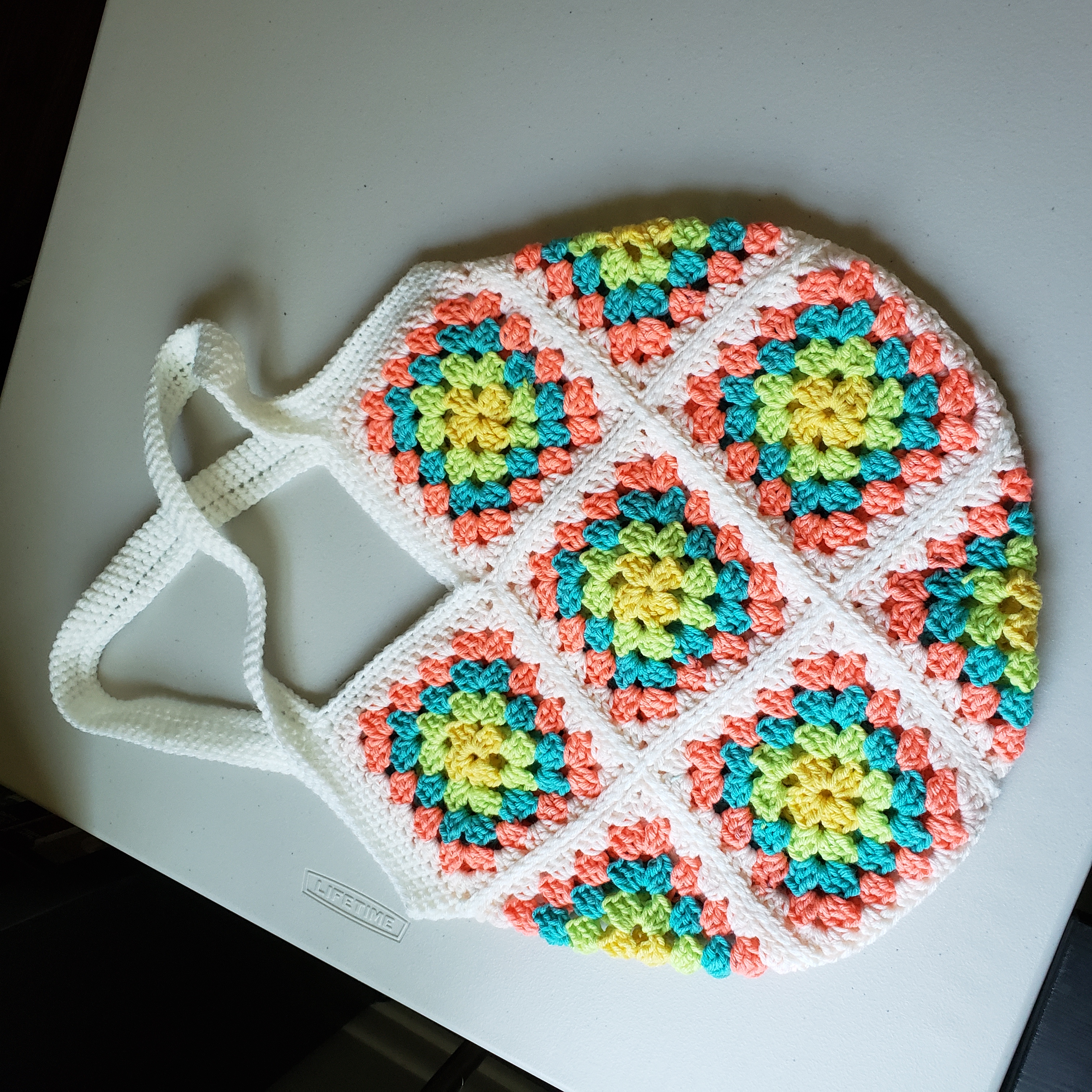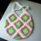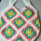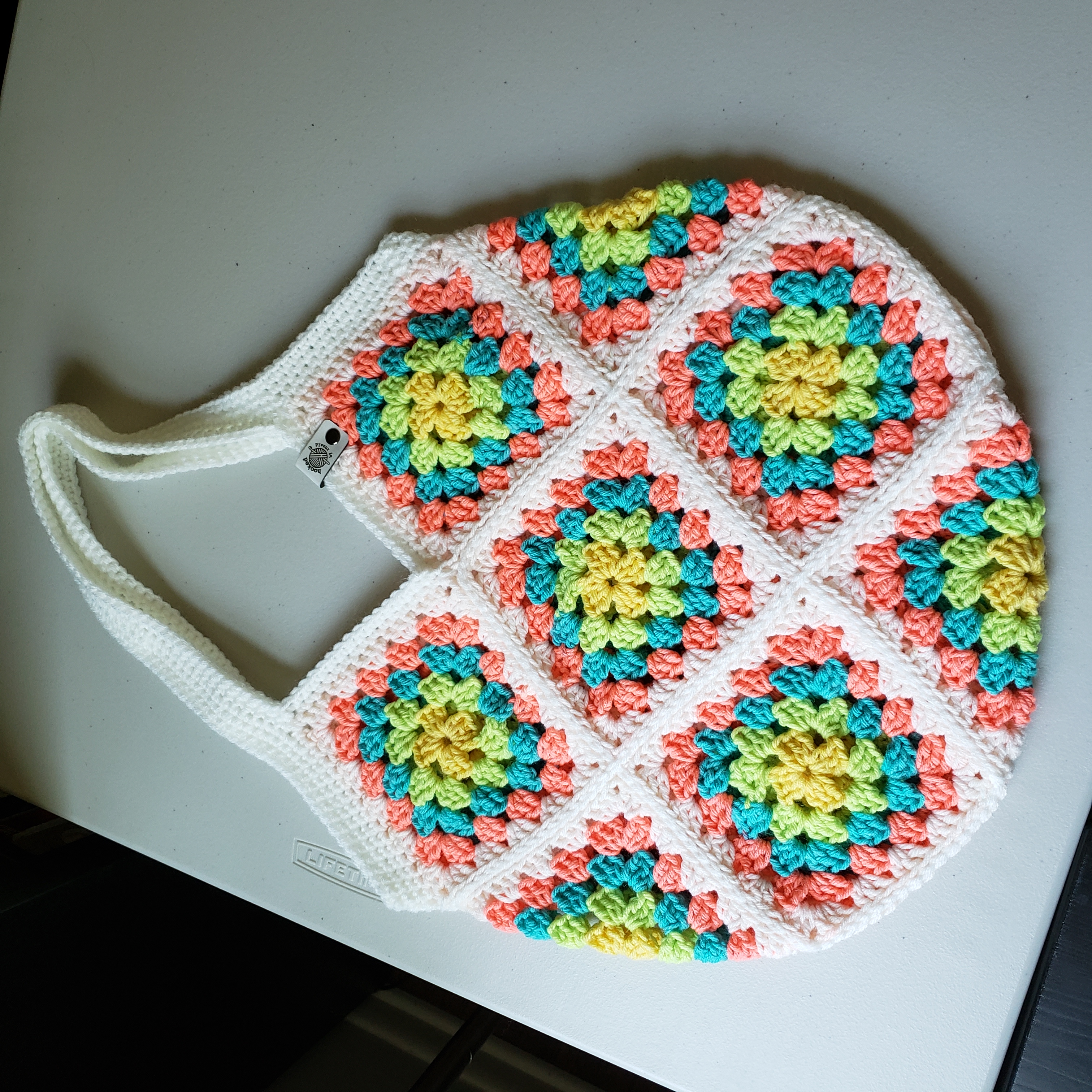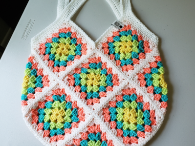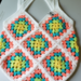 This is my handmade crochet tote bag. The bag is unlined and made with 100% acrylic yarn. The bag comes in many colorways, but this one is made with a yarn called All In One Granny Square in the colorway Rainbow Sherbet. Includes faux leather Hooked By Ronald tag.