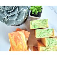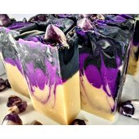 Ingredients; olive oil, coconut oil, soybean oil, mango seed butter, sunflower oil, castor oil, food grade sodium hydroxide, coconut milk, kaolin clay, soap safe micas, sodium lactate, eco glitter, fragrance. Net wt. 5.1oz, 146g.