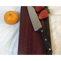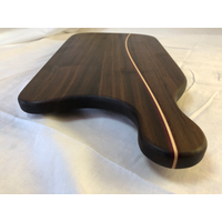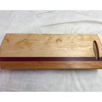 Random strips of domestic with spots of exotic woods make for a simple but extraordinary looking cutting board that can also be used as a charcuterie board as it's carved finger grips are for ease of moving and cleaning while its think enough to be a solid cutting board, it's light enough to handle.