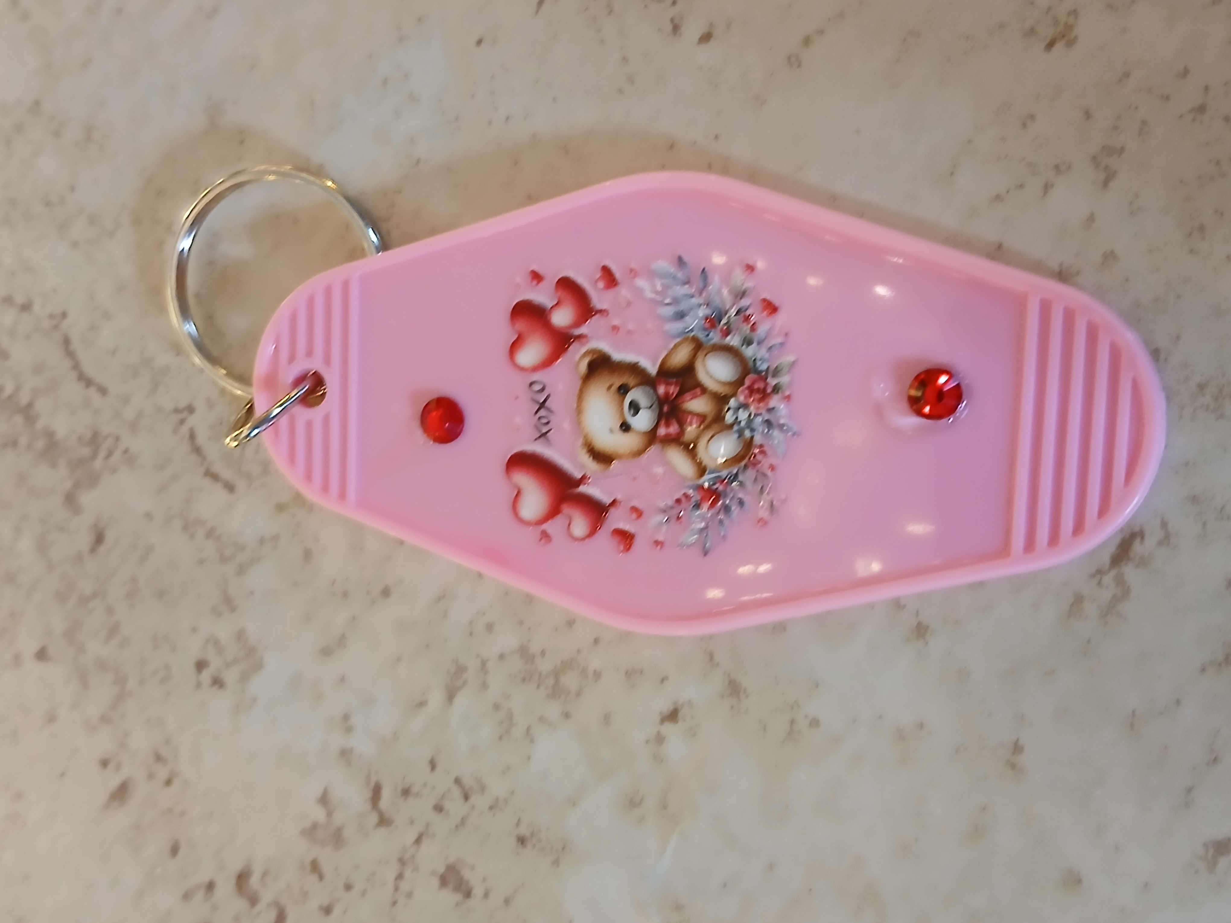 Randomly chosen Valentines day themed hotel key chains. Plastic replicas of the old fashioned hotel key chains used in hotels. comes in random colors and designs.