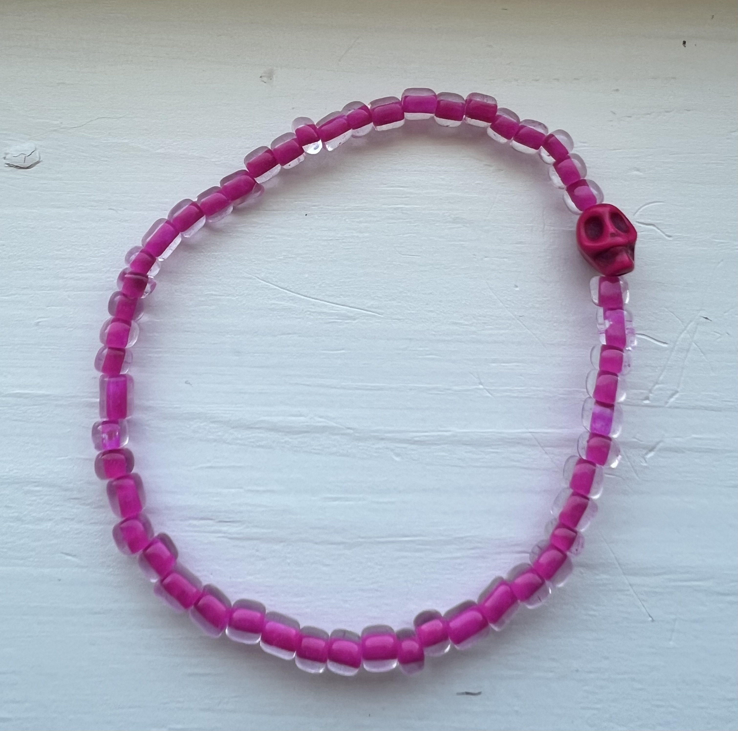 Turn up the color with Raspberry Spirit Skull Bracelet, a flirty beaded bracelet that’s equal parts punk and playful. Glossy fuchsia glass beads pair with a carved magenta skull charm, bringing a burst of rebellious energy to your wrist.