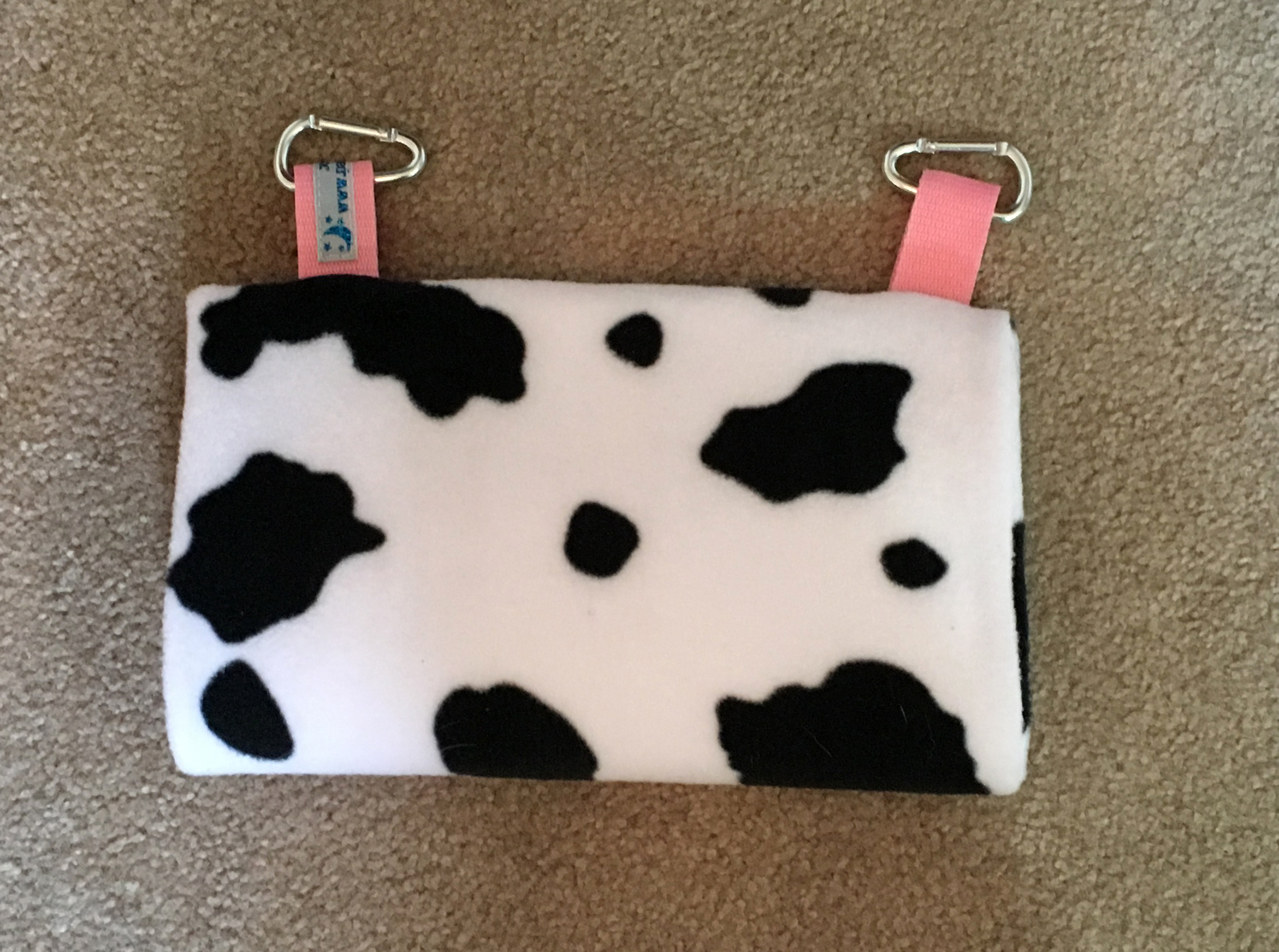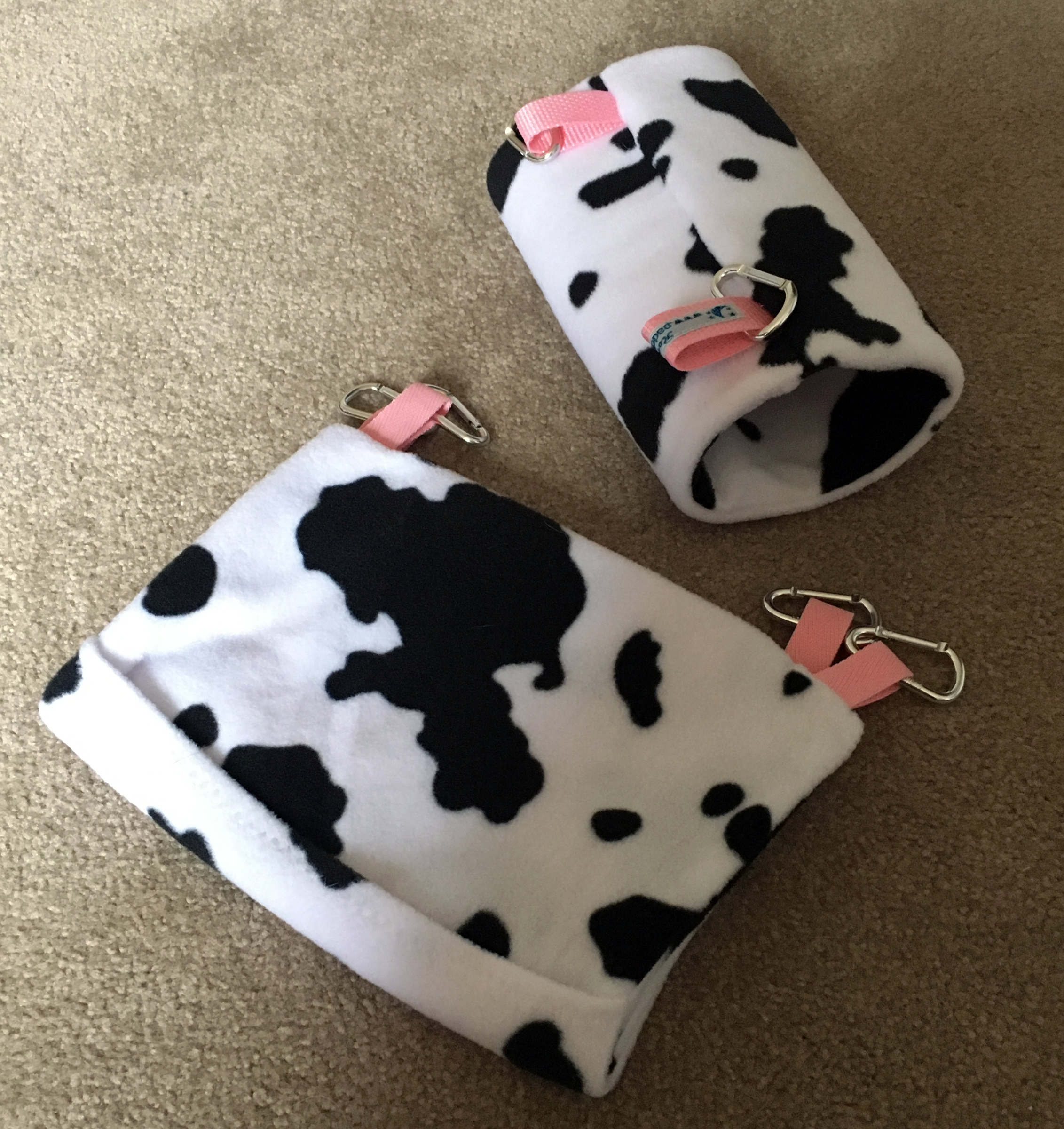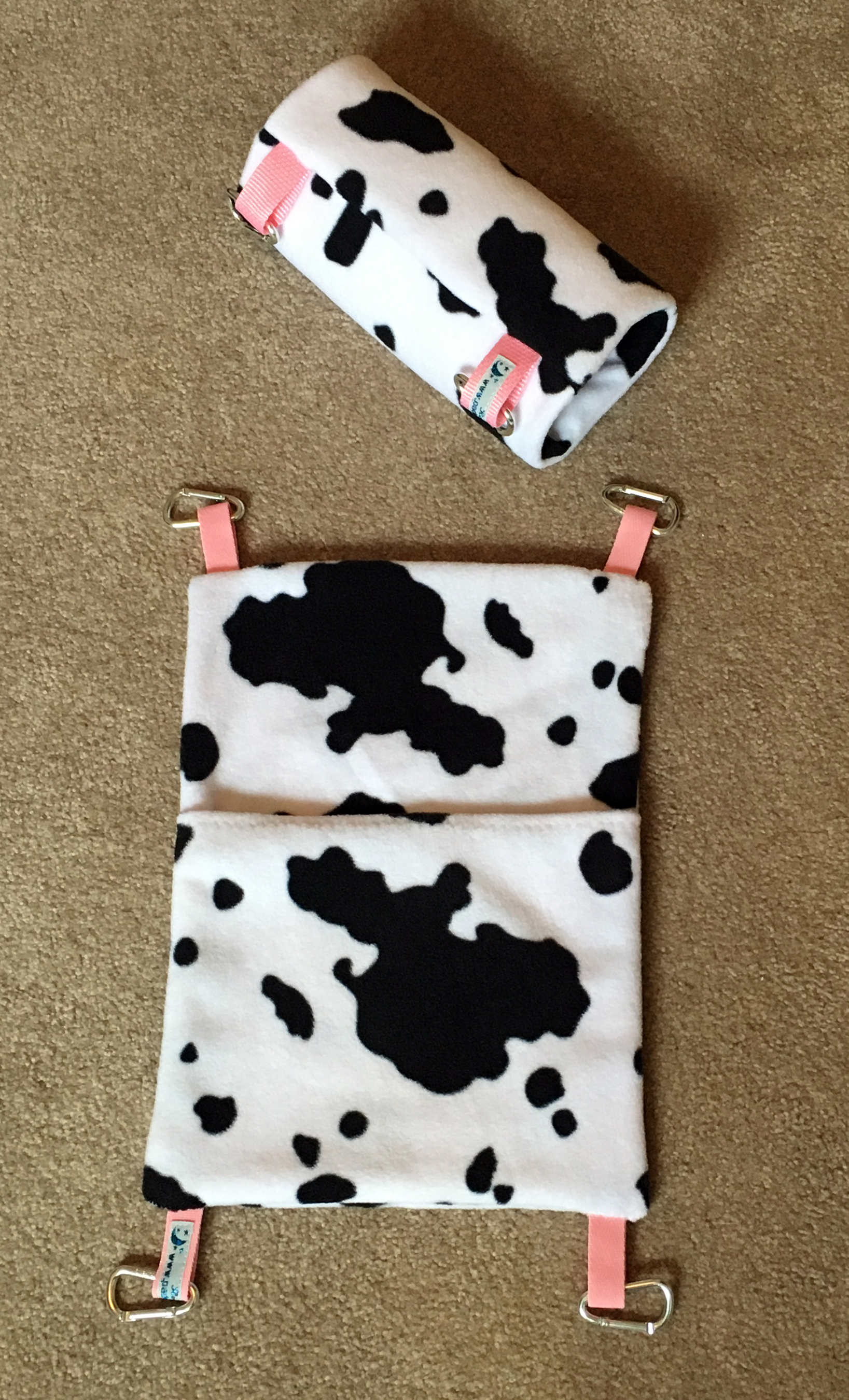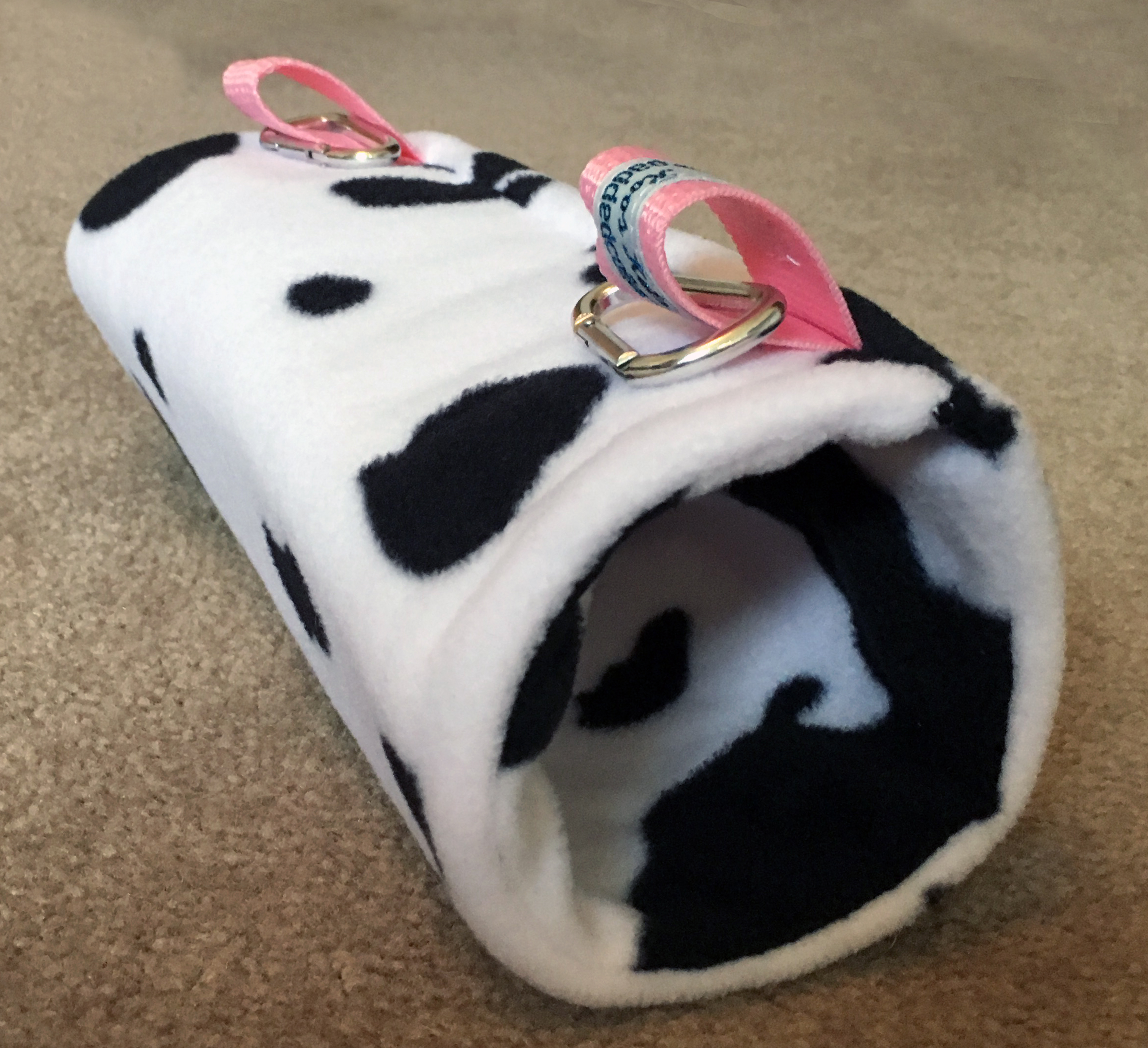 TUBE HAMMOCK: Padded doubled soft fleece. There are 2 webbing hanging tabs on top, with carabiners. Measures approx. length: 10.2" (26cm) height: 6.3" & 8.2" including the tabs (16cm / 21cm inc. tabs) diameter: 3.9" / 10cm (internal) Each hammock includes metal hanging carabiners which make it very, very easy to clip the hammocks on and off the cage. Machine washable.