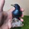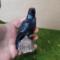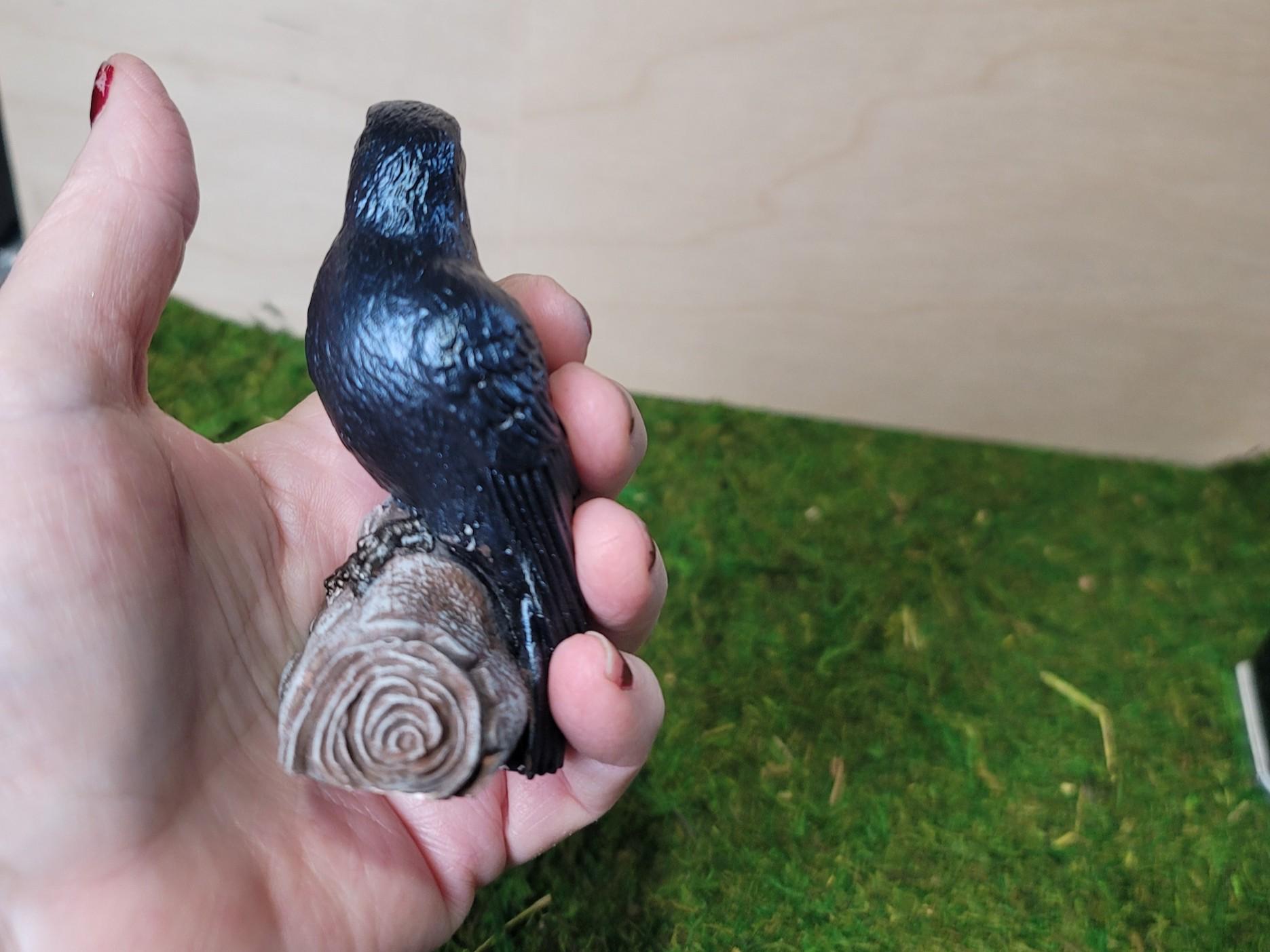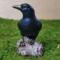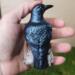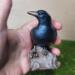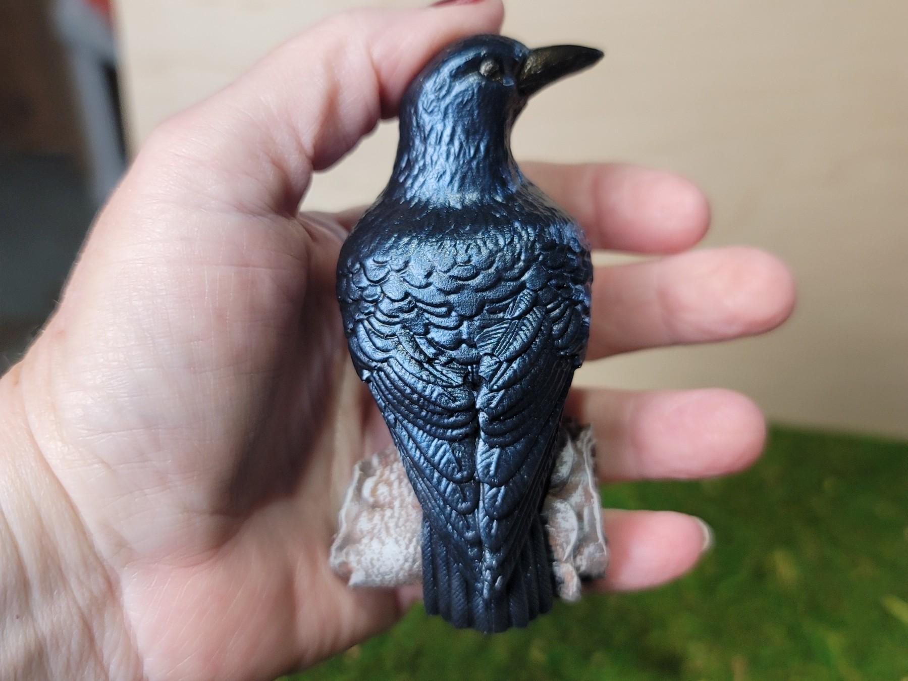 Raven or Crow? I say raven! The tail feathers are squared off so that says raven to me. Either way, they do symbolize the same things; Intelligence and knowledge. Our ancestors believed that they were messengers from the spirit world. now I am not claiming that, but I am claiming that it is just stinkin CUTE! It stands 3.5" tall and the log is about 1.75" wide. Its the perfect size for a shelf or altar.