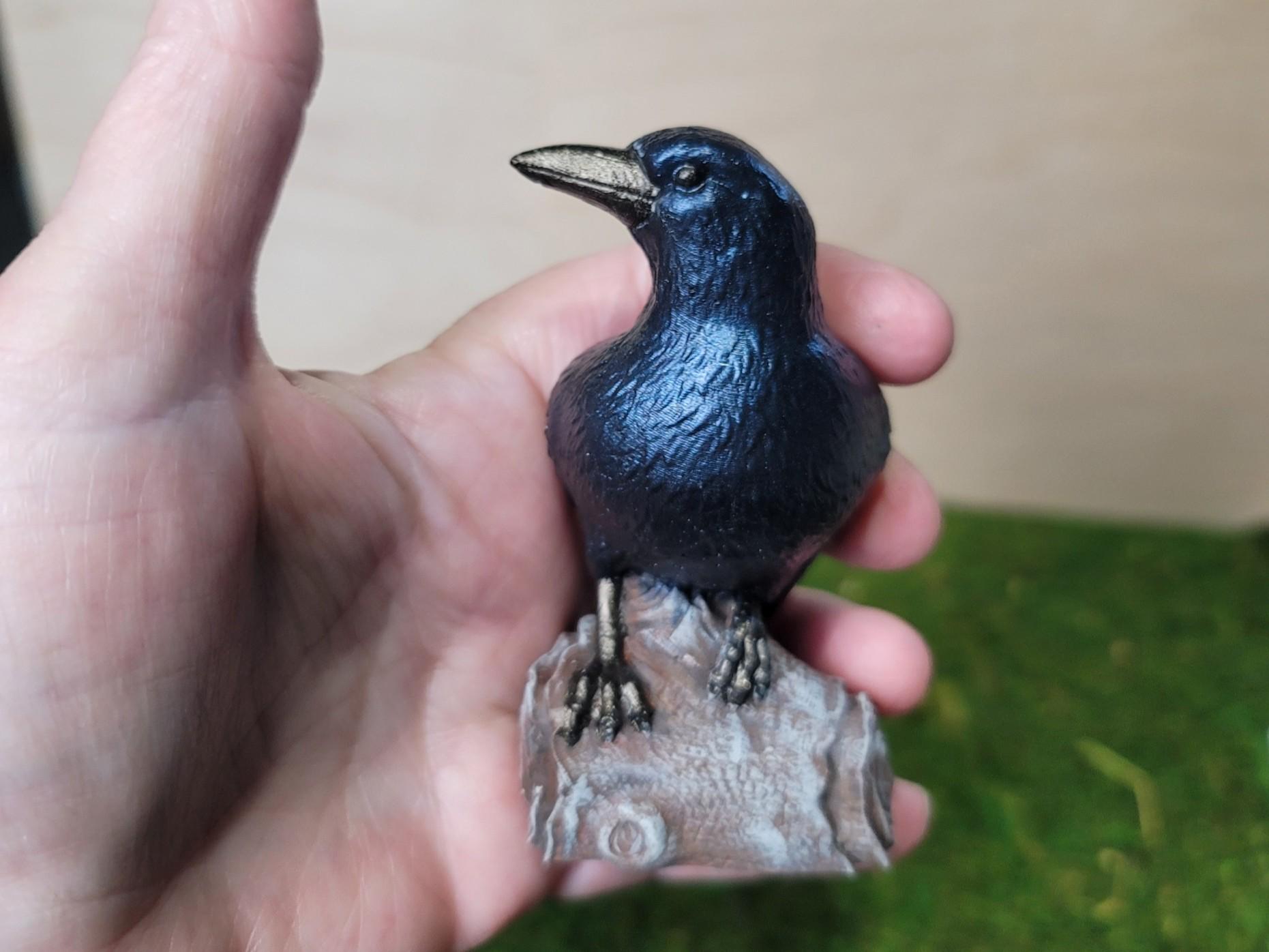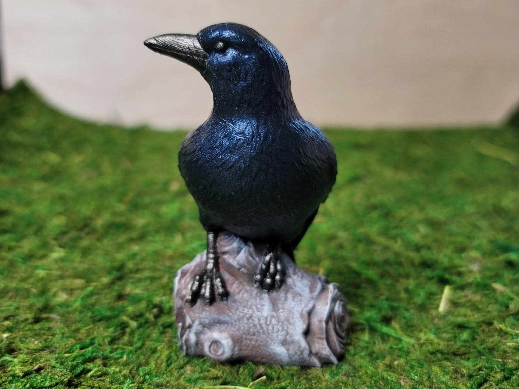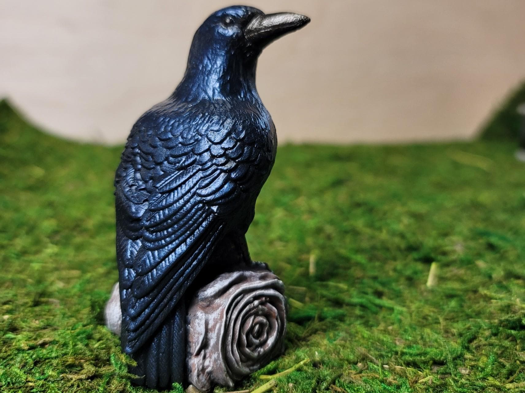I hand paint each piece that i make. I use the same paint every time but i am human, it could slightly vary from piece to piece. The paint on the feathers is an iridescent black that has a deep bluish hue to it. The beak and talons are painted with a black that has a slight goldish hue. The log is where the slight changes may occur. I've layered 4 different satin finish acrylic paints to add depth; dark brown, chocolate, gray and beige.