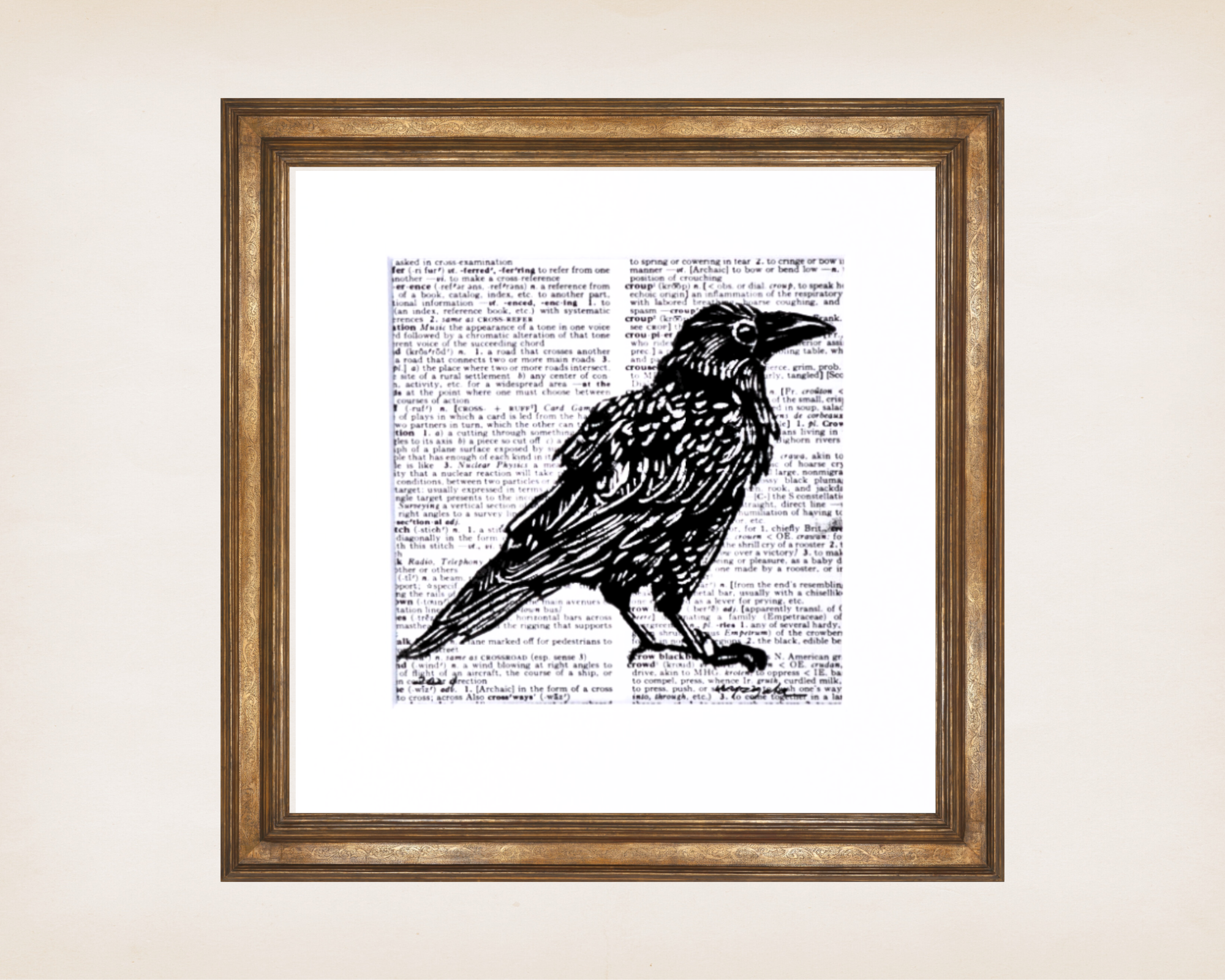The curious raven linocut printed on an old dictionary page that looks amazing!