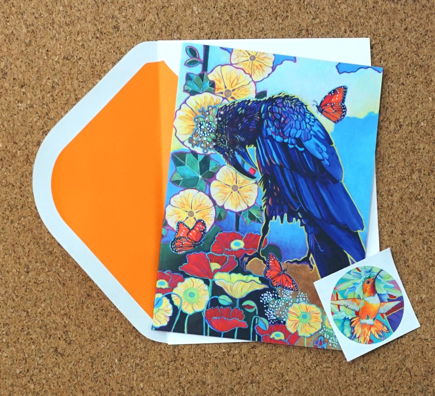 This stunning card features the artwork "The Crowning of the Trickster Raven", showcasing a raven adorned with delicate baby's breath, surrounded by vibrant poppies and graceful butterflies, all inspired by an original painting.