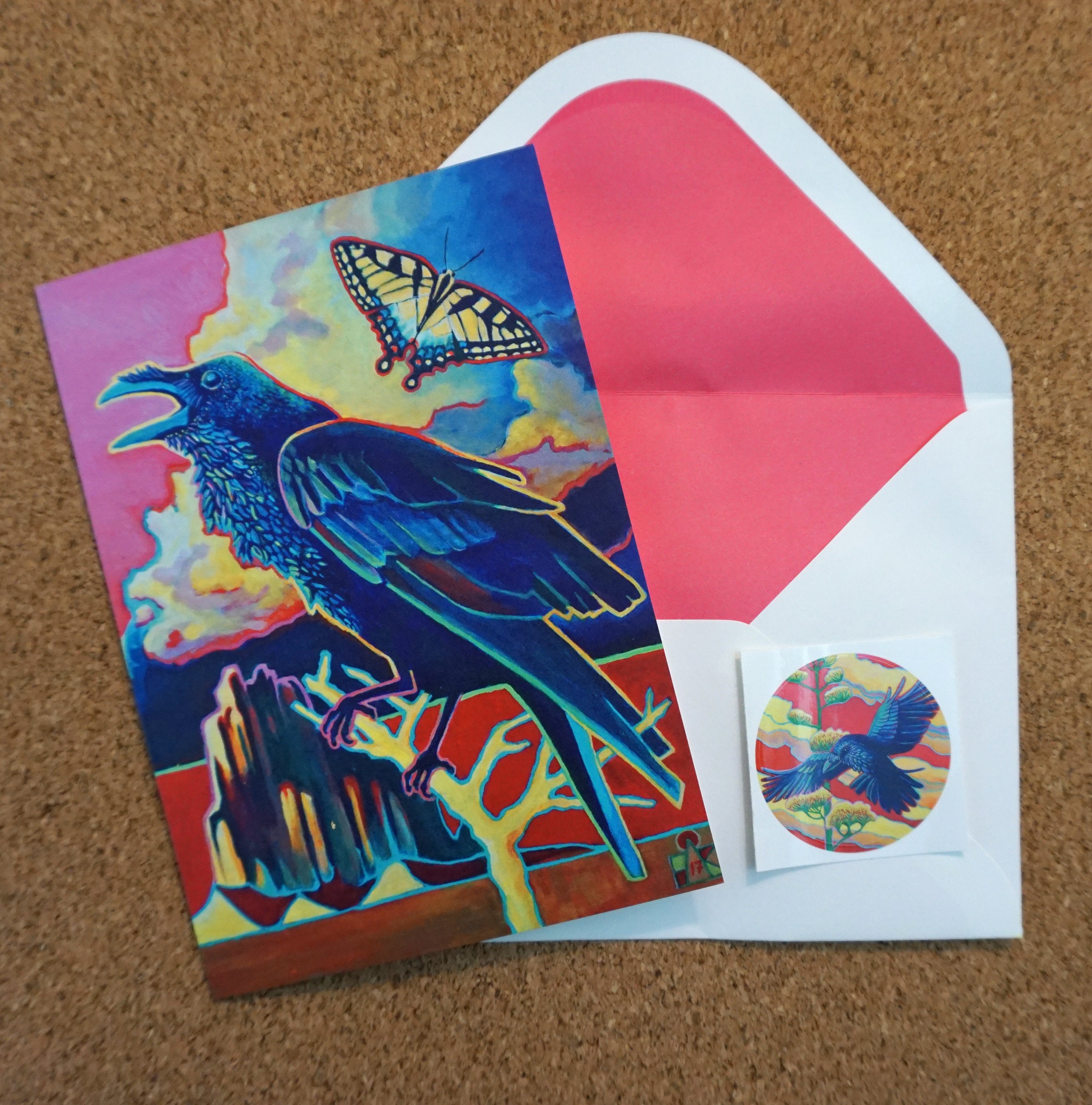 Raven with Shiprock Greeting Card An Attractive whimsical note card featuring a Raven greeting the sun, Shiprock and a cloud are in the distance, and a butterfly fly past. made from an original painting in acrylic medium depicting a hummingbird flying by a San Pedro cactus with a thunderhead in the background.
