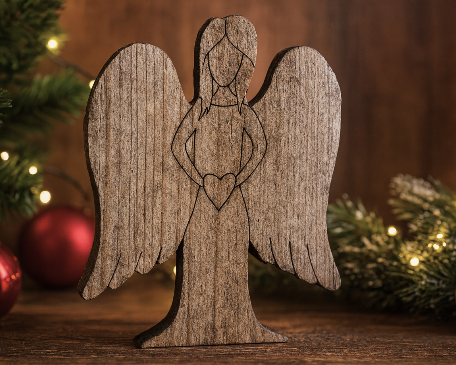 This rustic reclaimed wood angel brings warmth and meaning to your holiday decor. Handcrafted from weathered wood, each piece showcases unique natural grain and character, making every angel one of a kind. The simple engraved details highlight the angel’s serene silhouette, with outstretched wings and a heart held close, symbolizing love and peace. Its natural distressed finish gives it a timeless farmhouse charm, perfect for displaying on mantels, shelves, or as part of a festive centerpiece. Whether given as a heartfelt gift or kept as a cherished decoration, this wooden angel adds a touch of rustic beauty and heartfelt spirit to the Christmas season.