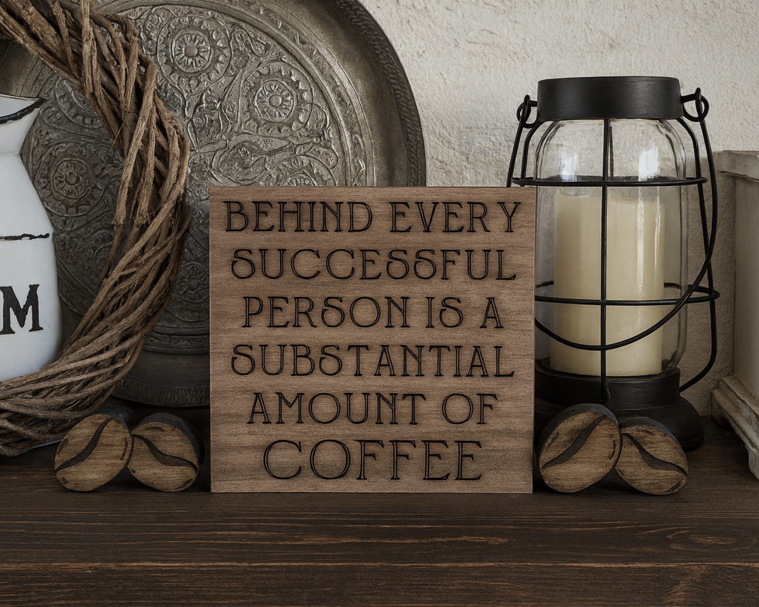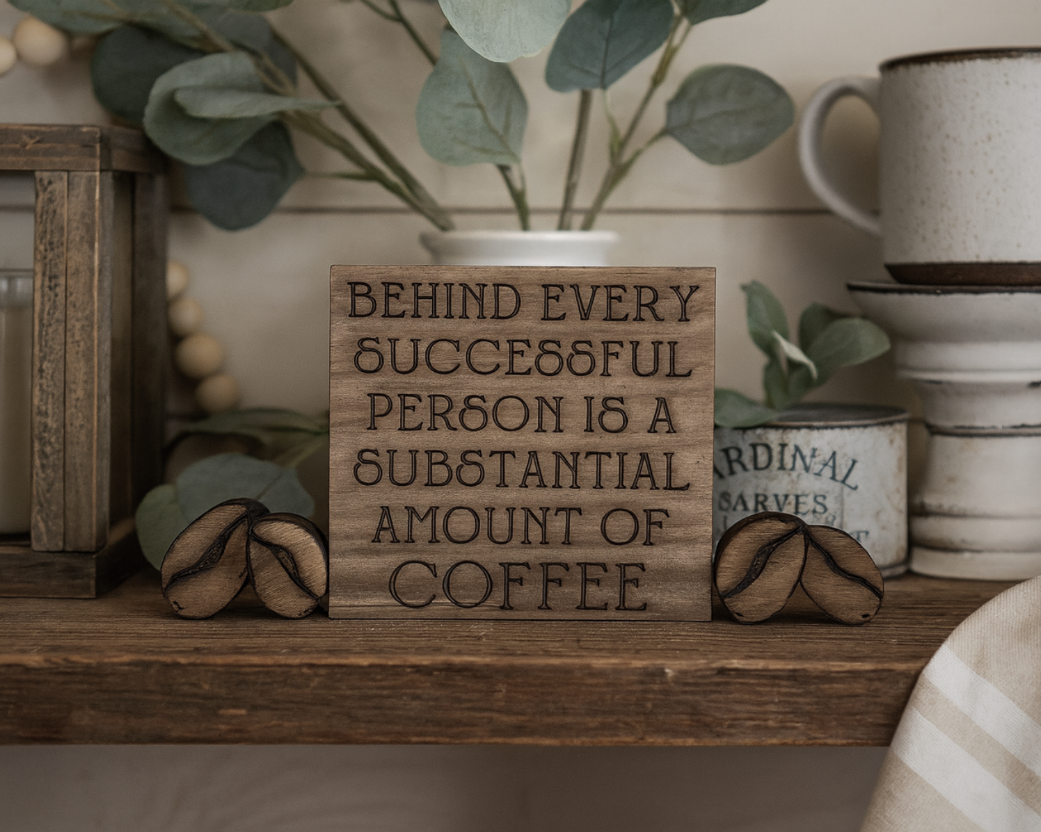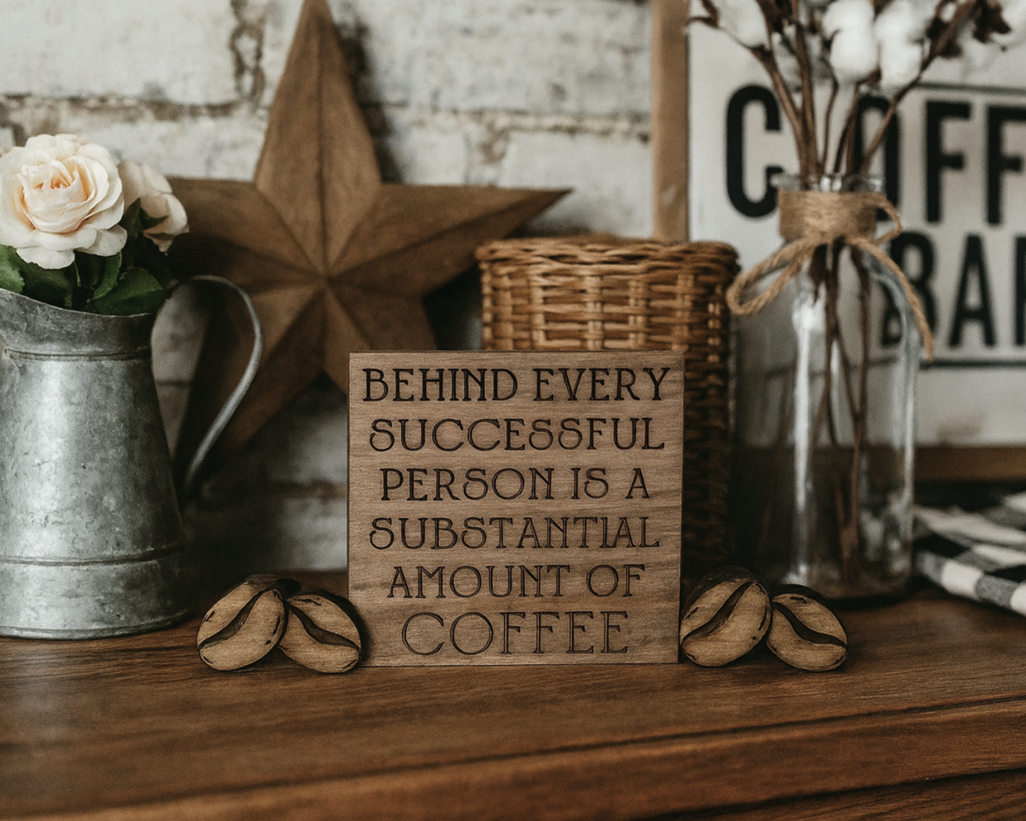 Coffee Sign (3.5 inches) – Freestanding and engraved with the saying “Behind Every Successful Person Is A Substantial Amount Of Coffee.” alongside a coffee branch detail. Perfect for tiered trays, coffee bars, or farmhouse shelves.