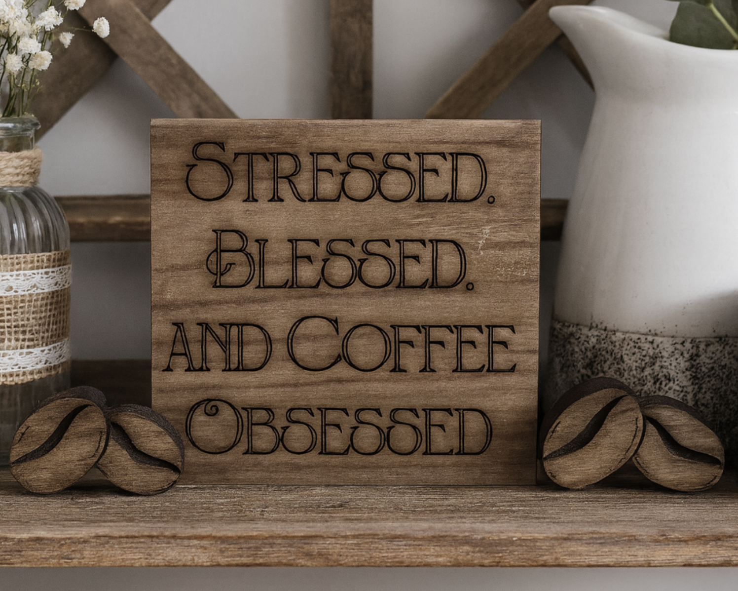 Coffee Sign (3.5 inches) – Freestanding and engraved with the saying “Stressed, Blessed, and Coffee Obsessed.” alongside a coffee branch detail. Perfect for tiered trays, coffee bars, or farmhouse shelves.