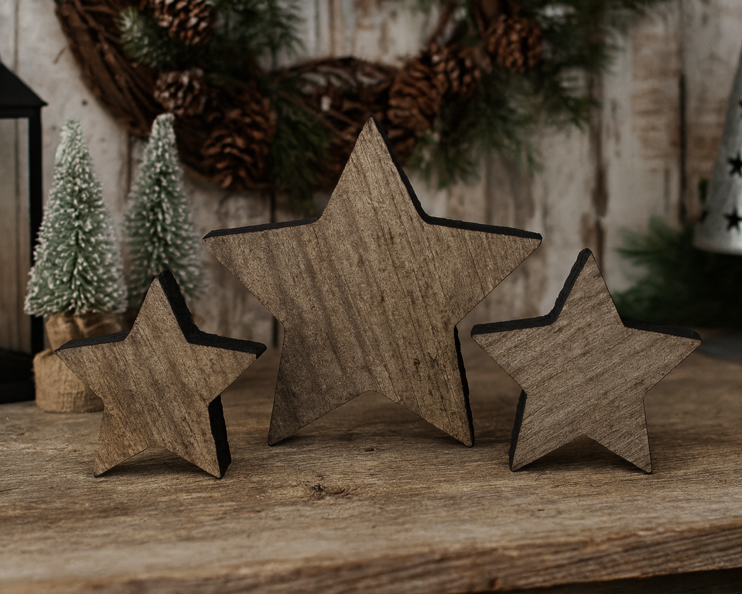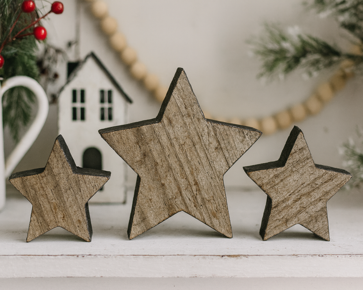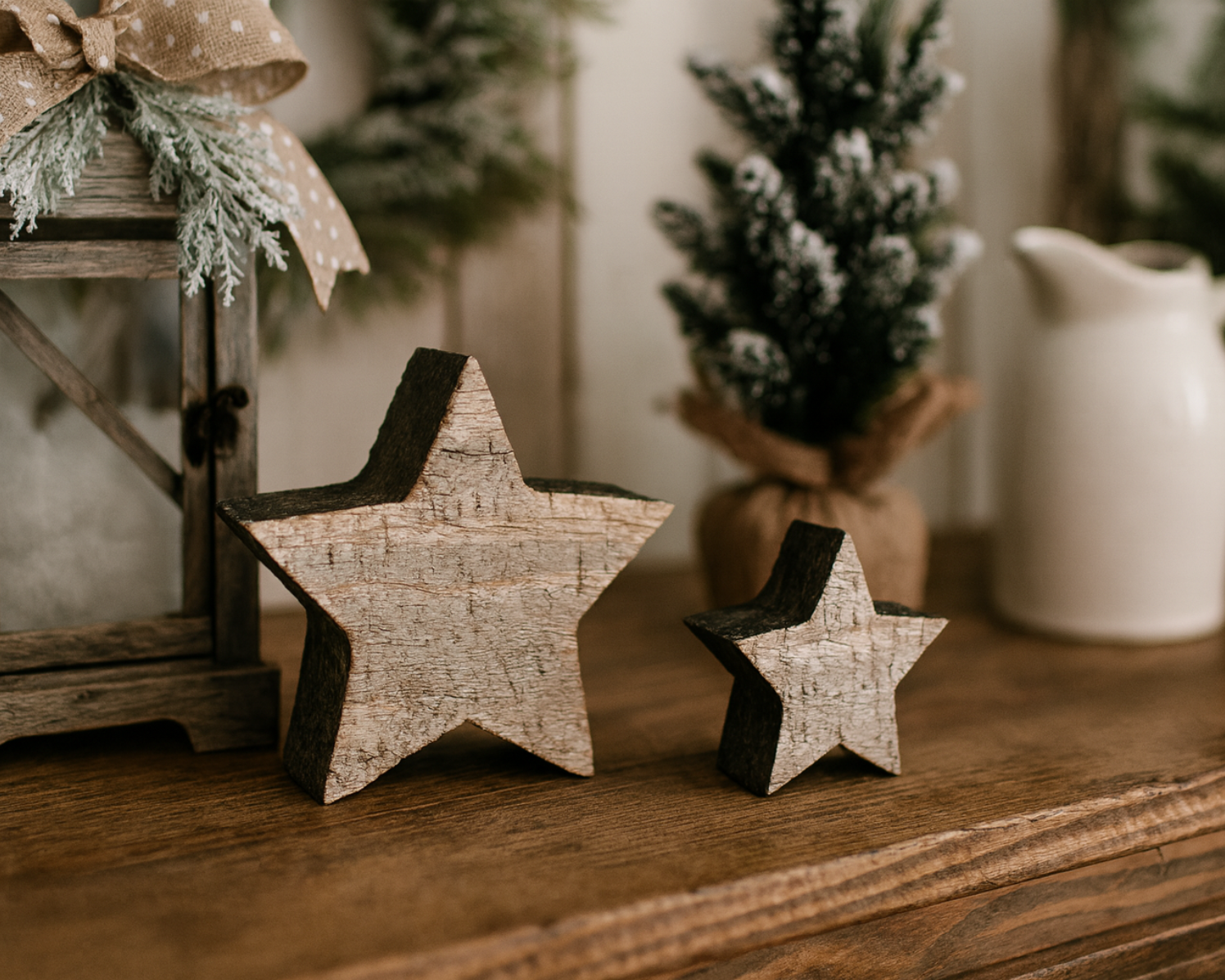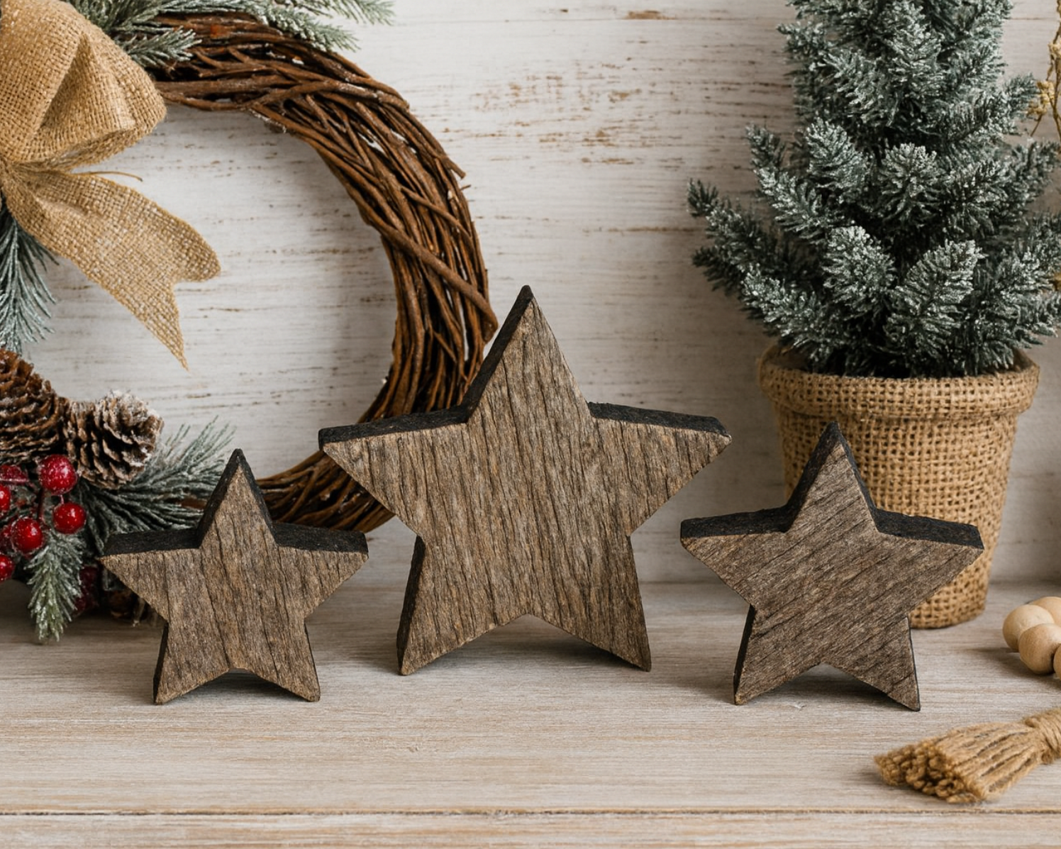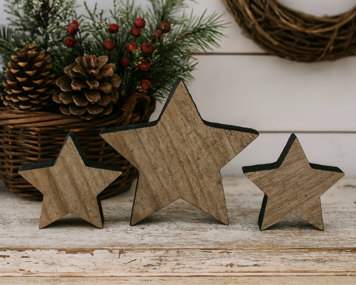 These rustic reclaimed wood stars bring a warm, farmhouse charm to your seasonal décor. Each star is carefully cut from weathered wood, showcasing its natural grain and a beautifully worn texture that tells a story of age and character. The edges are darkened for a bold, finished look, giving them depth and definition whether displayed on their own or styled alongside greenery, wreaths, or holiday accents. Perfect for tiered trays, mantels, shelves, or table centerpieces, these stars add a timeless handmade feel to your home. Available individually in two sizes 2 inches or 3 inches, you can mix and match for a layered look or select your favorite size to suit your space. Whether used for Christmas decorating or year-round rustic charm, these reclaimed wood stars are versatile pieces that bring simple, natural beauty to any setting.