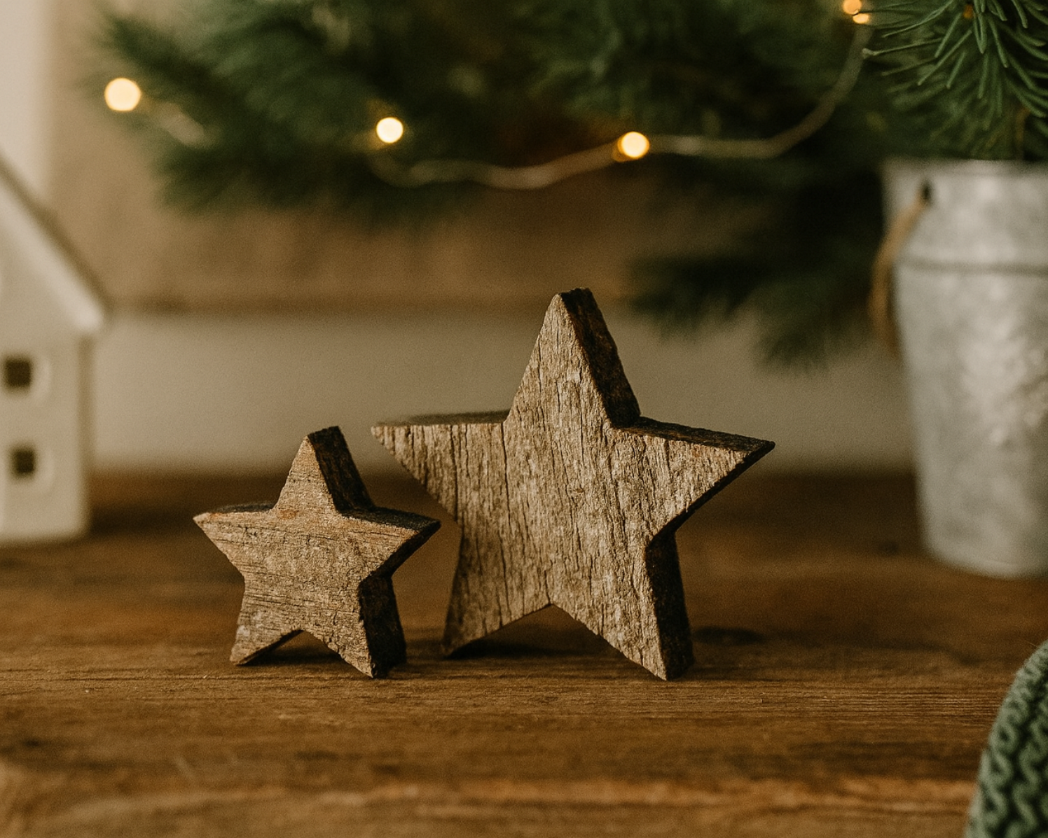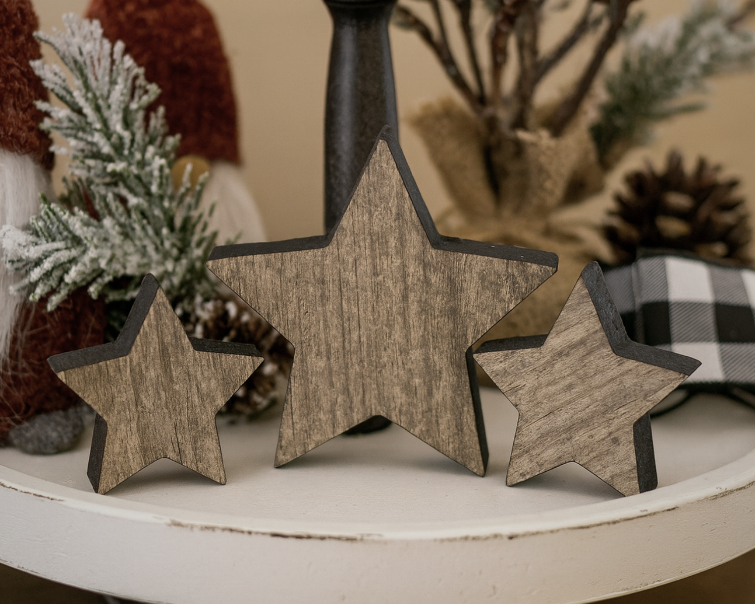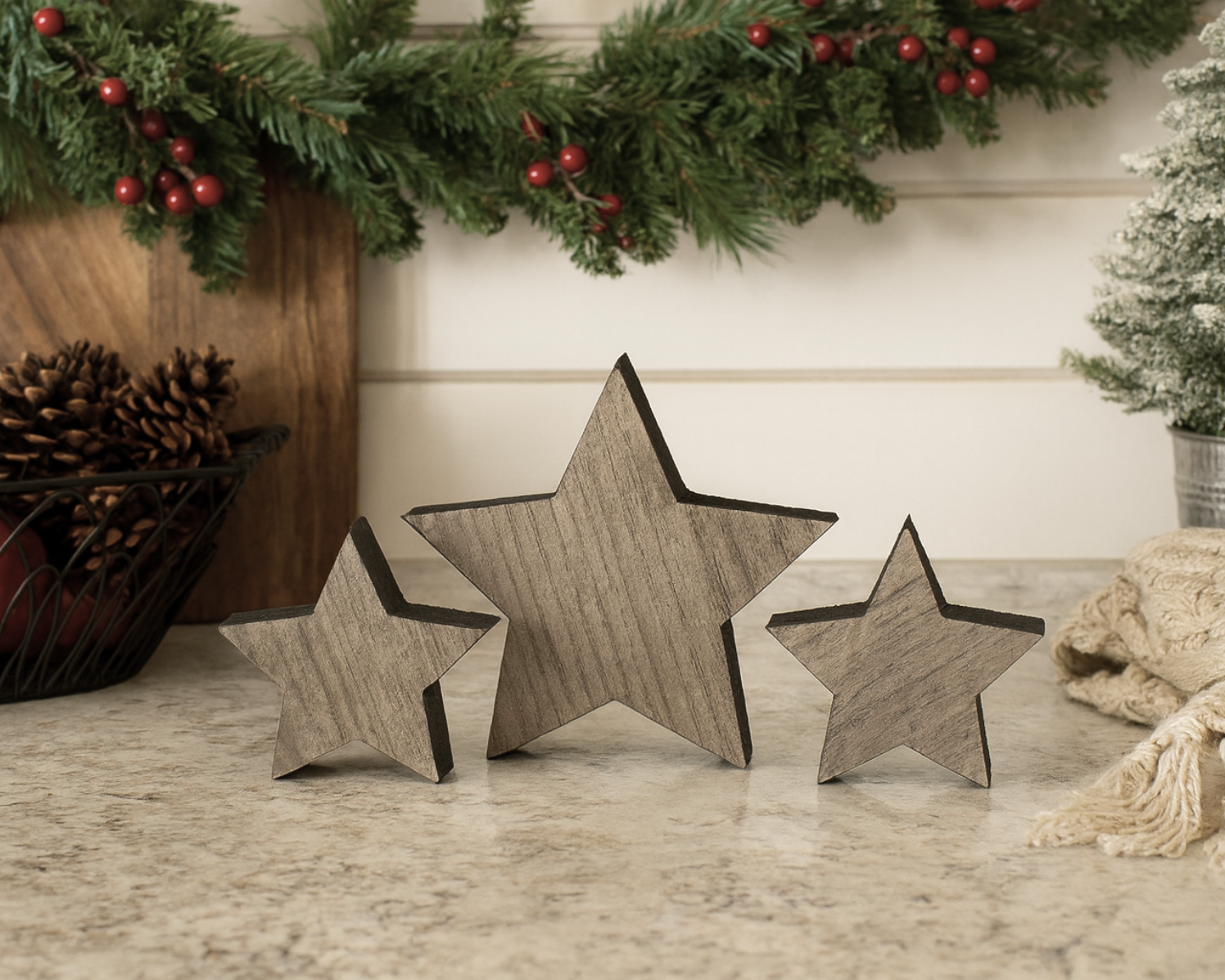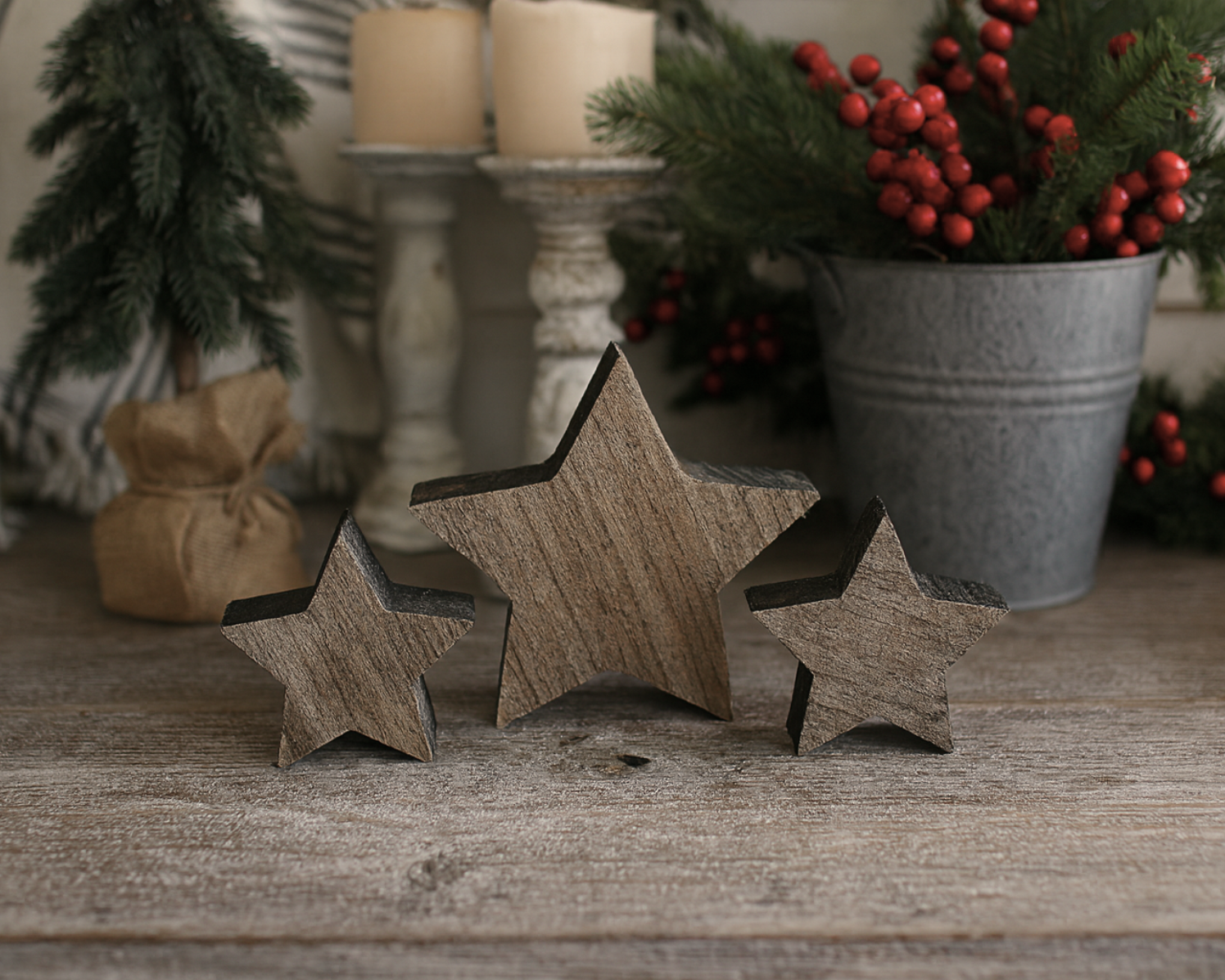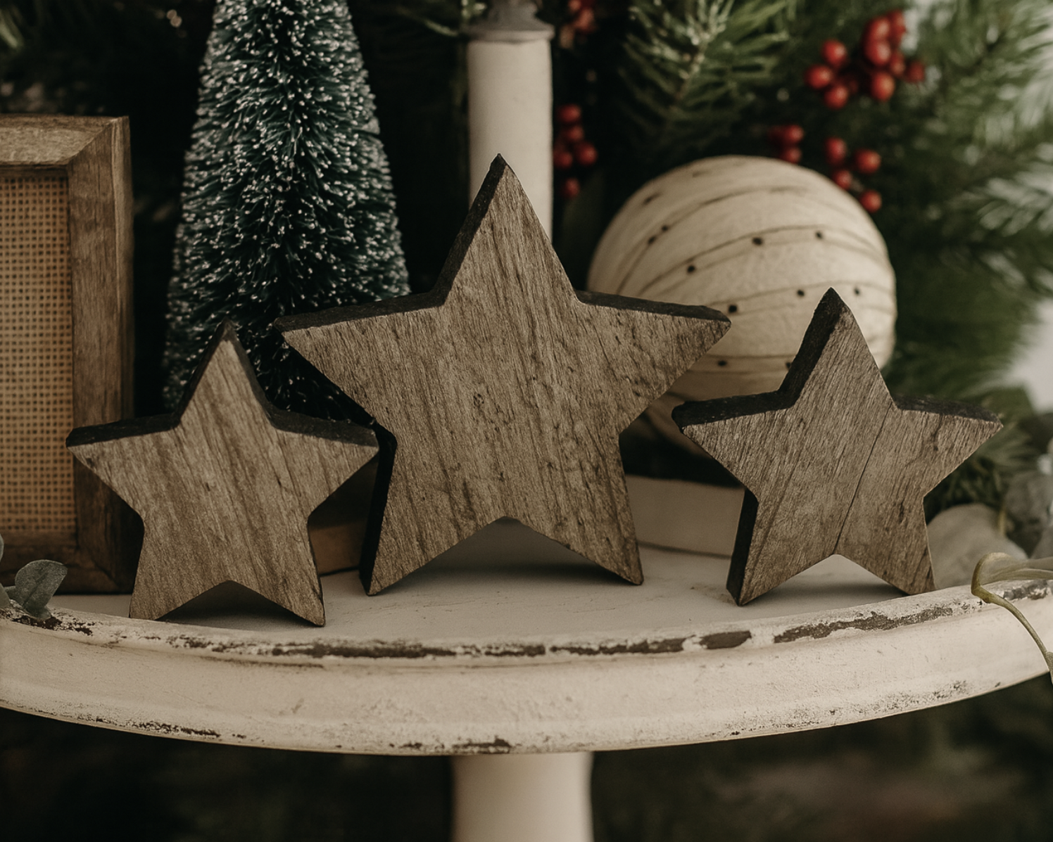 These rustic reclaimed wood stars bring a warm, farmhouse charm to your seasonal décor. Each star is carefully cut from weathered wood, showcasing its natural grain and a beautifully worn texture that tells a story of age and character. The edges are darkened for a bold, finished look, giving them depth and definition whether displayed on their own or styled alongside greenery, wreaths, or holiday accents. Perfect for tiered trays, mantels, shelves, or table centerpieces, these stars add a timeless handmade feel to your home. Available individually in two sizes 2 inches or 3 inches, you can mix and match for a layered look or select your favorite size to suit your space. Whether used for Christmas decorating or year-round rustic charm, these reclaimed wood stars are versatile pieces that bring simple, natural beauty to any setting.