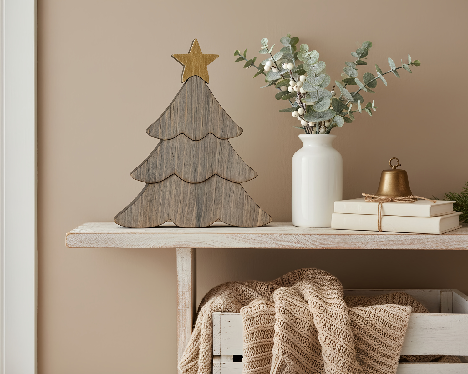 Bring the charm of rustic craftsmanship into your holiday décor with this handcrafted reclaimed wood Christmas tree. Each piece is made from a single solid slab of reclaimed wood, ensuring natural character, visible grain, and varying beautifully weathered texture that gives every tree its own unique story. The engraved details create a layered tree effect, while the top is adorned with a hand-painted gold star that adds a warm, subtle shimmer, the perfect touch of understated elegance.