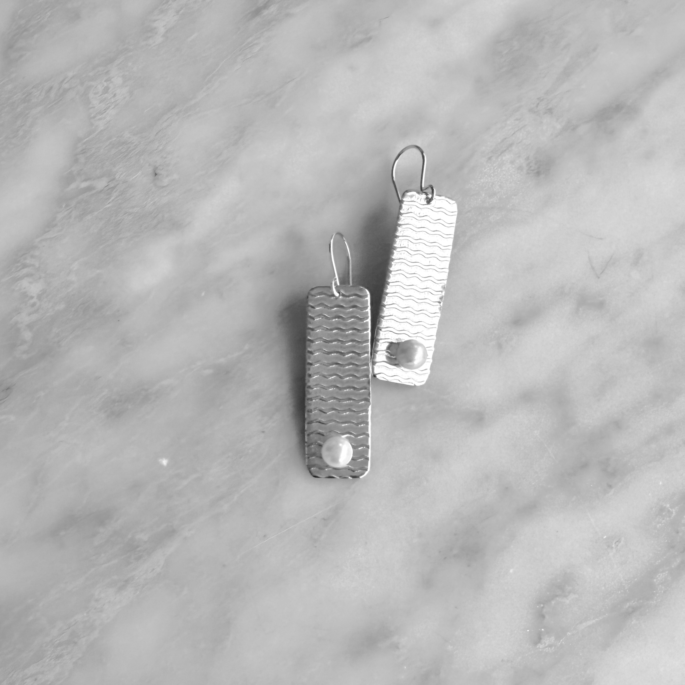 Beautifully textured lead-free, rectangular pearl pewter earrings with sterling silver ear wires. Not only do these earrings have a beautiful texture, but they have a beautiful shine to them. The length of the earring itself is 1 1/2 inches and the width is 1/2 inches. The drop on the earrings is one and three-quarters inches. The earrings come with a rubber ear nut to prevent loss; every item sold is gift-boxed and ready to give. These earrings are made by hand. The beauty of the lead-free pewter is that it is less prone to tarnish. Polishing pads are great for polishing the pewter and sterling. They can be purchased on Amazon.