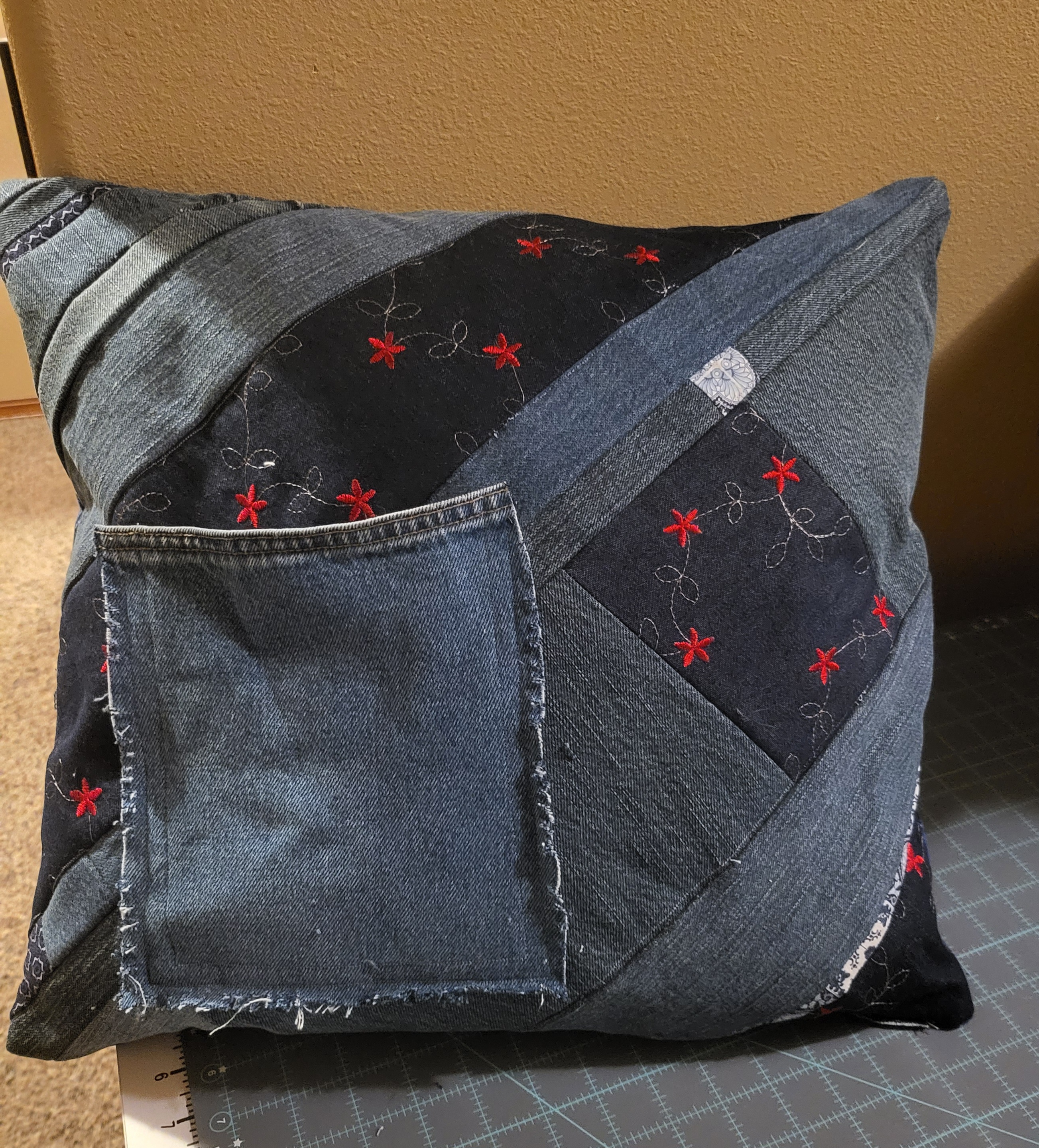 18×18 upcycled denim and flannel throw pillow