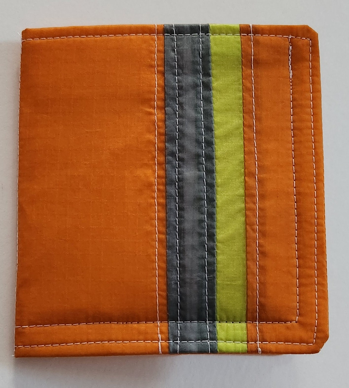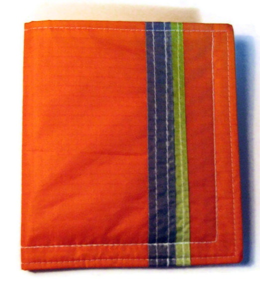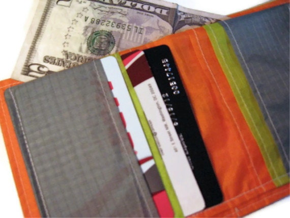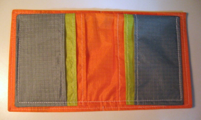 THE THINNESTTHE COOLEST THE LIGHTEST THE ECO-IST This minimal slim men's bi-fold wallet has been fashioned from a recycled paraglider. Once floating among the clouds the fabric is now working hard as a tough rugged wallet. After procuring the paraglider wing it is first disassembled and then washed. The fabric is then cut into usable sized strips. From there I can proceed to design, layout, cut, and stitch a wallet. Folded this eco friendly wallet measures 4 x 4 inches and opened out flat it measures 4 inches x 8 inches and is practically weightless. The orange, chartreuse and gray interior echoes the exterior with stripes colors. The minimalist wallet has one large pockets for cash and receipts and six credit card pockets for cards and I.D. Center fold facing card pockets for added security. This wallet is so flat you can sit on it comfortably in your back pocket but it will fit even shirt pockets. Incredibly durable ripstop nylon. Washable. A nice gift for your green friends! Please visit my shop to see my other geometric and striped wallets as well as lots of other recycled paraglider items Lighten your load and reduce your footprint. Follow along on Instagram: www.Instagram.com/offchutes