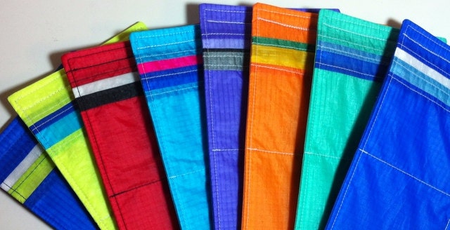 Glance up to the sky on a warm summer day in Southern Oregon and you just might be treated to a man-made rainbow. Woodrat Mountain is home to two yearly international paragliding competitions involving hundreds of fliers. Paraglider wings are made up of two layers of fabric connected by a series of open baffles that fill with air to keep the flier suspended and floating on thermal winds. The fabric is ripstop nylon. Ripstop has a grid of metallic threads imbedded in the fabric that gives it strength and rip resistance. When a paraglider wing can no longer pass the required safety inspections these incredibly large fabric wings are packed off to the landfill. They can no longer be used and must be kept out of the reach of children and uncertified adults. When a friend mentioned he had decommissioned wings to take to the landfill I had to take a look. These huge flying giants were gorgeous. Bright, brilliant bold colors that hung in the air like bits of fireworks. So different from the matte finish cottons in muted and deep colors that I usually worked with making art quilts and wall hangings. I deconstruct the massive wings strip and baffle at a time, then wash all the strips and hang them out to dry in the sun. And then the interesting work begins.... What was once dirty, wrinkled and discarded is now transformed into useful, beautiful and fun wallets, bags, headbands, sachets, bookmarks and whatever else strikes my fancy. We can make beautiful things without polluting or damaging the planet. Follow me on Instagram...... Username: Offchutes and Pinterest: www.Pinterest.com/offchutes2