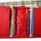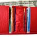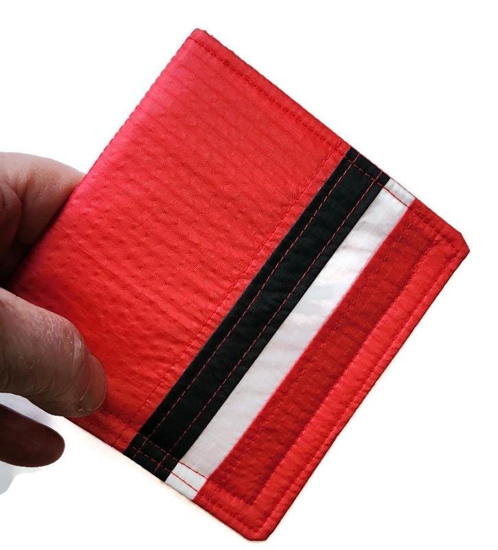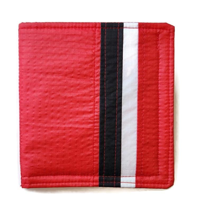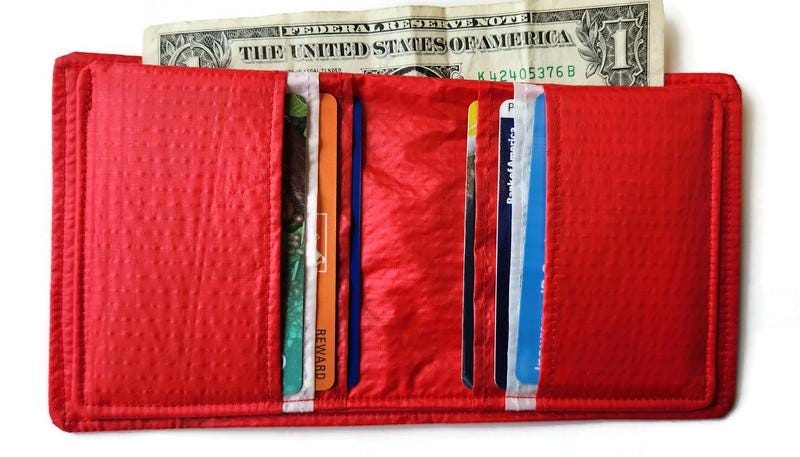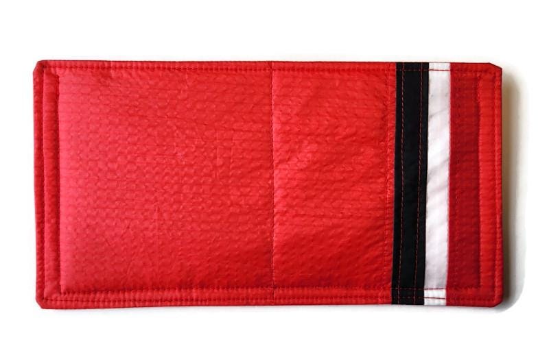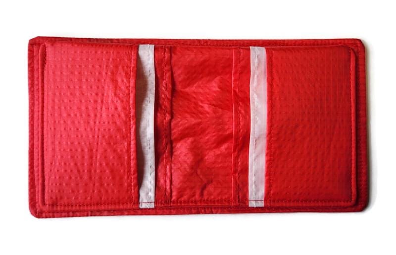 The red and white interior echoes the exterior with stripes colors. The minimalist wallet has one large pocket for cash and receipts and six credit card pockets for cards and I.D. The card pockets are center facing for added security. This wallet is so flat you can sit on it comfortably in your back pocket but it will fit even shirt pockets. Incredibly durable ripstop nylon. Washable. A nice gift for your green friends!