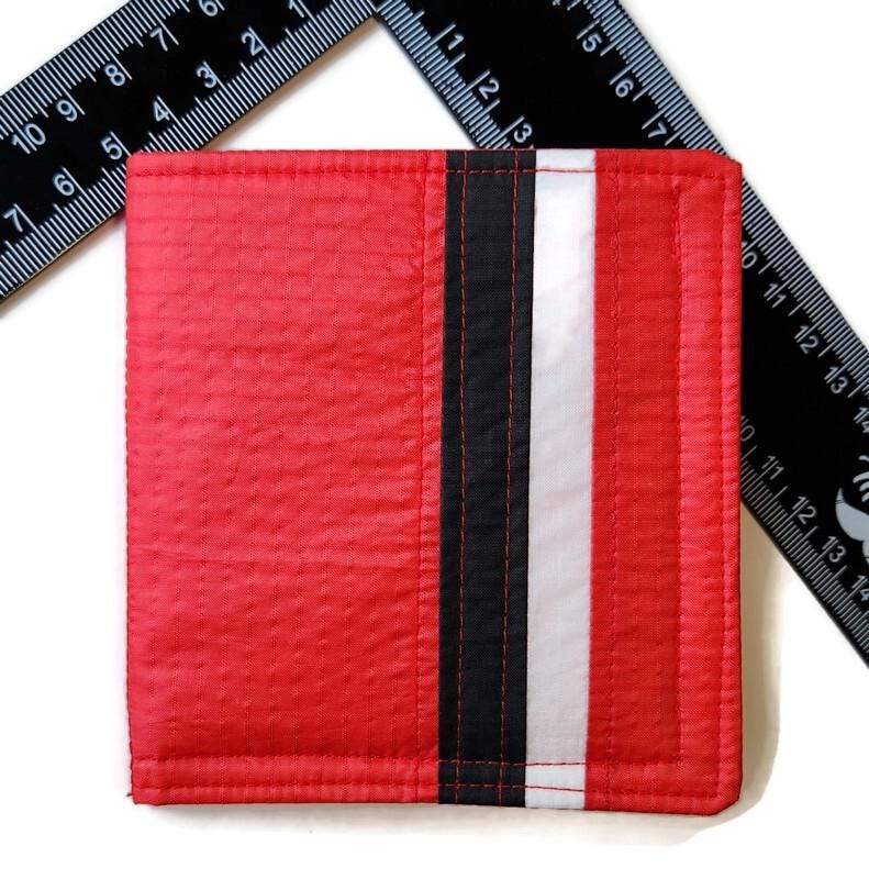 This ultralight men's bi-fold wallet has been fashioned from a recycled paraglider. Once floating among the clouds the fabric is now working hard as a tough rugged wallet. After procuring the decommissioned paraglider wing it is first disassembled and then washed. The fabric is then cut into usable sized strips. From there I can proceed to design, layout, cut, and stitch a wallet. Folded this eco friendly wallet measures 4 x 4 inches and opened out flat it measures 4 inches x 8 inches and is practically weightless.