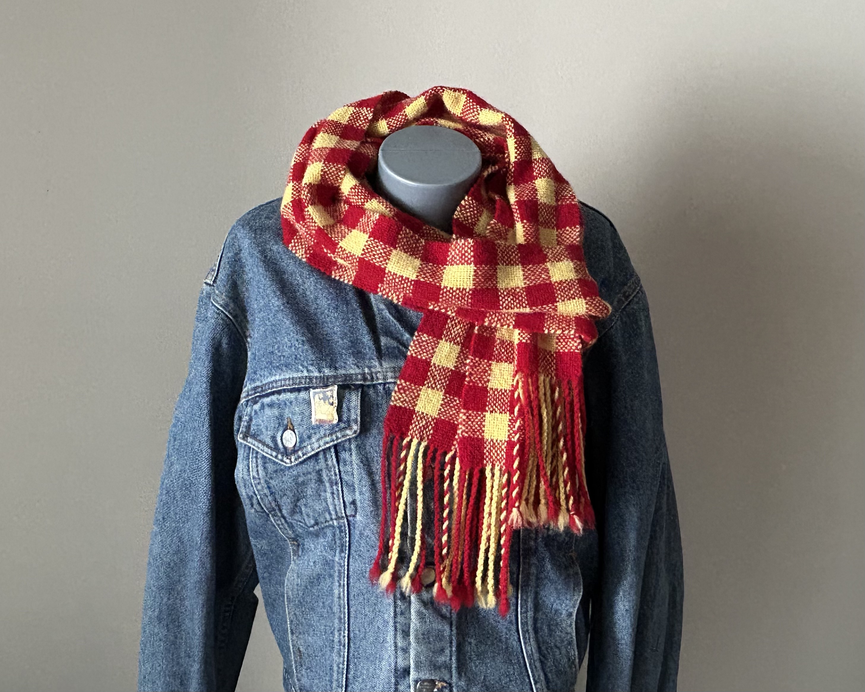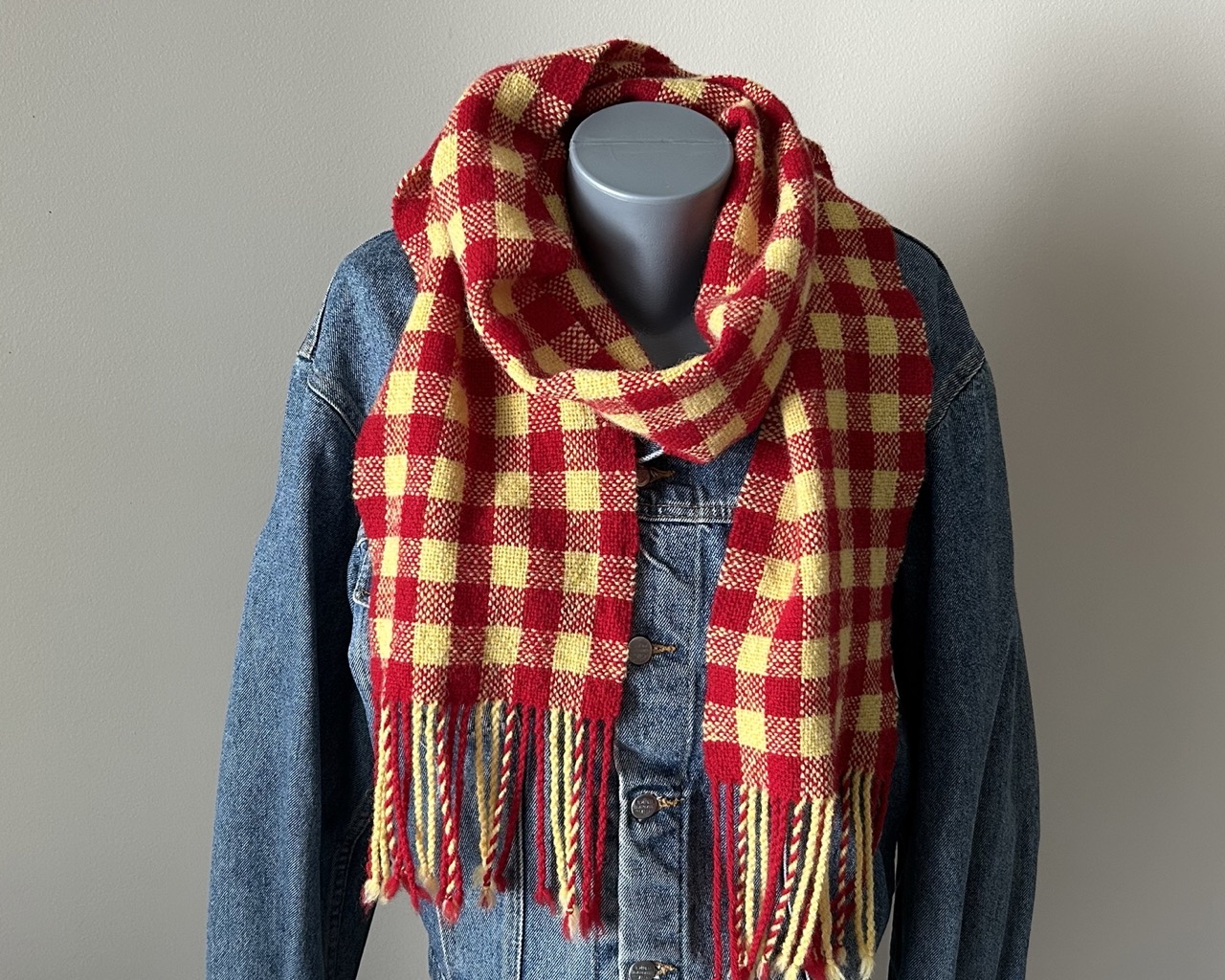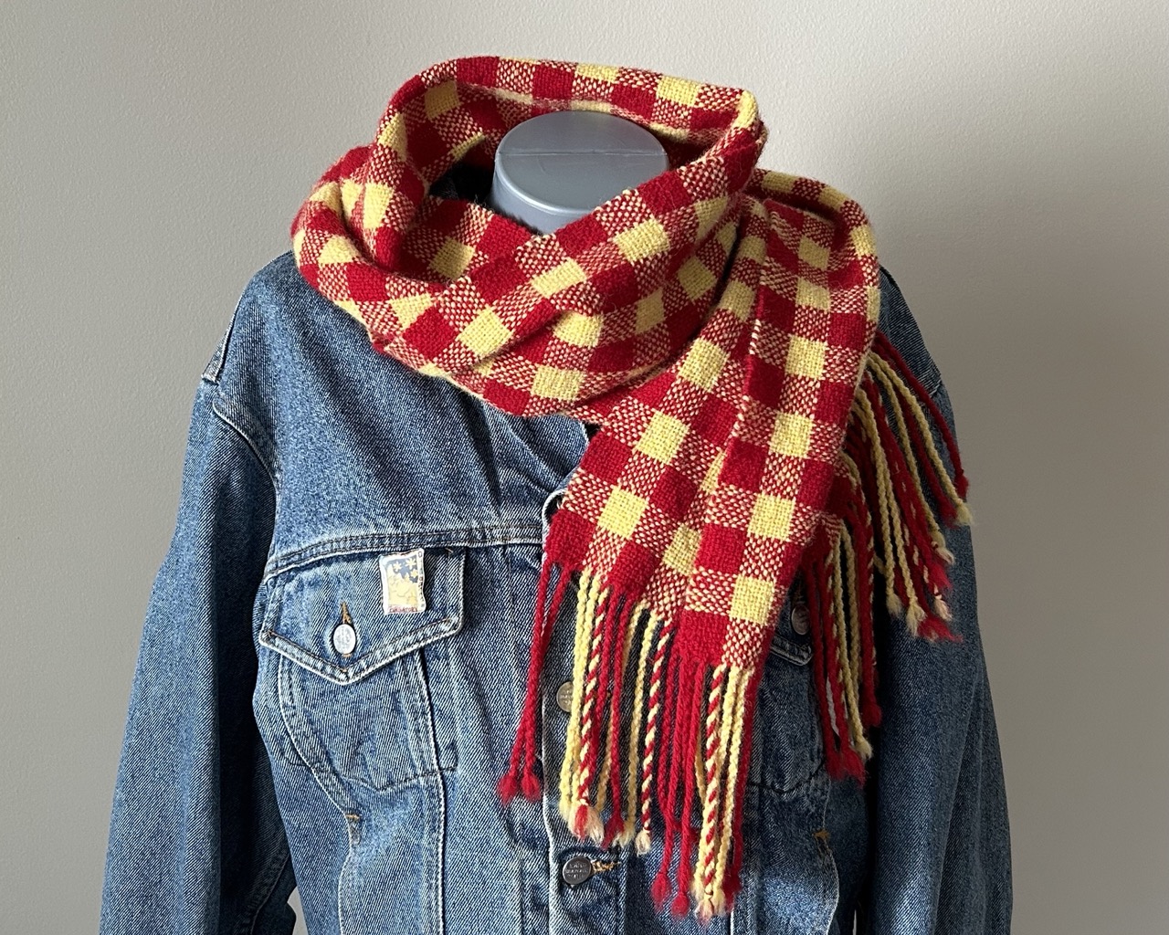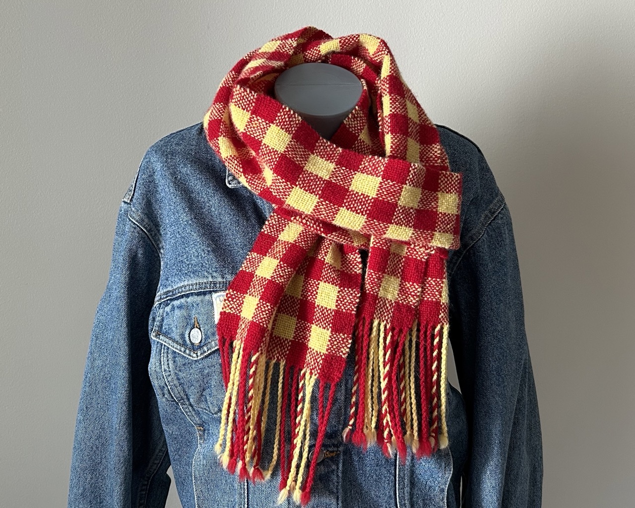 This extra long cozy scarf was envisioned for winter sports spectators and participants alike. Woven in a classic check pattern, let this bright red and yellow scarf declare your team loyalty.