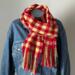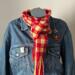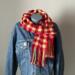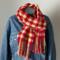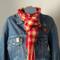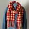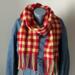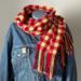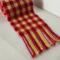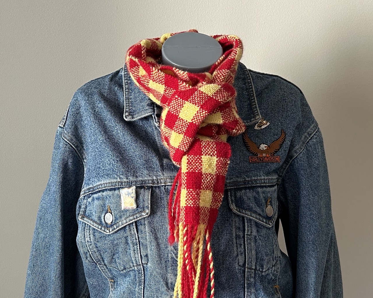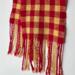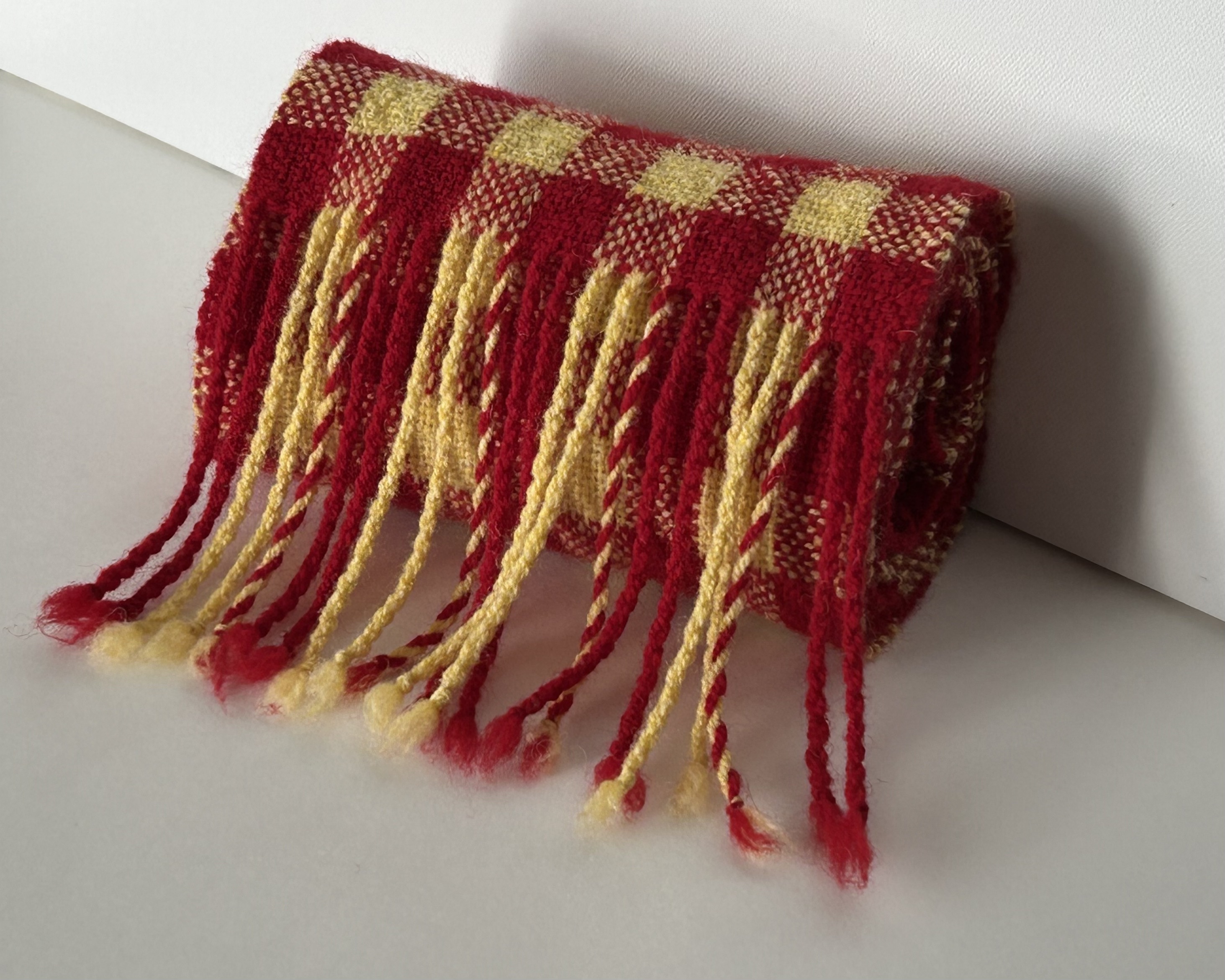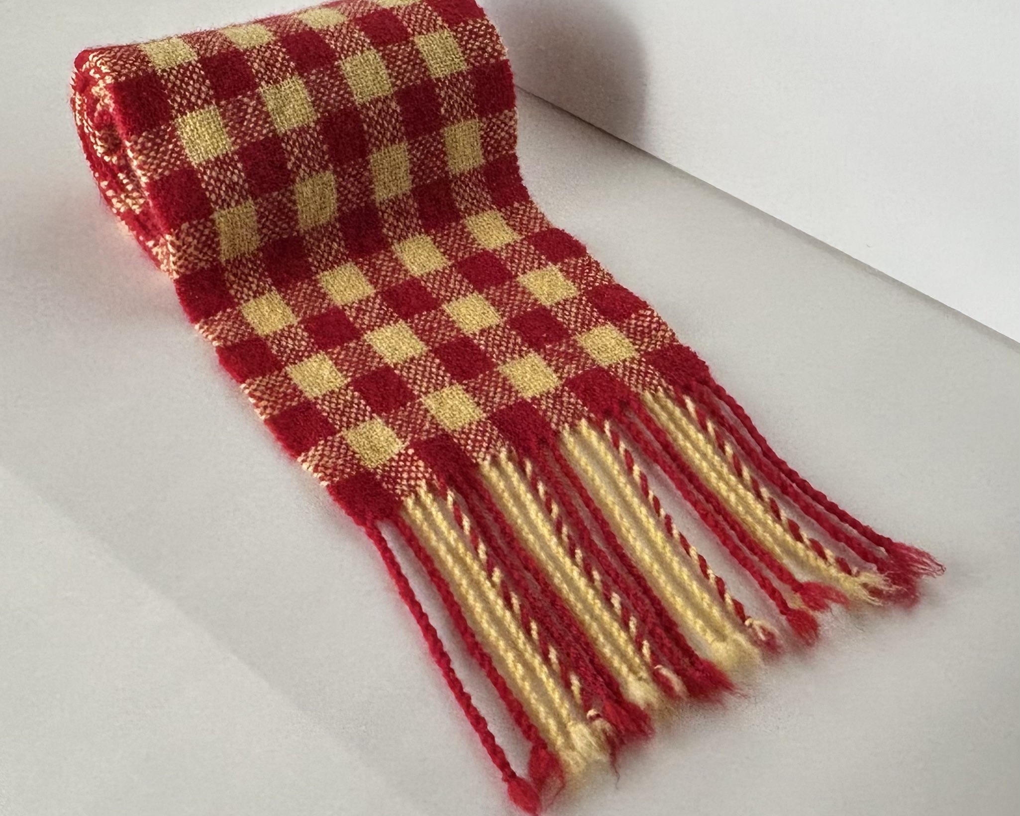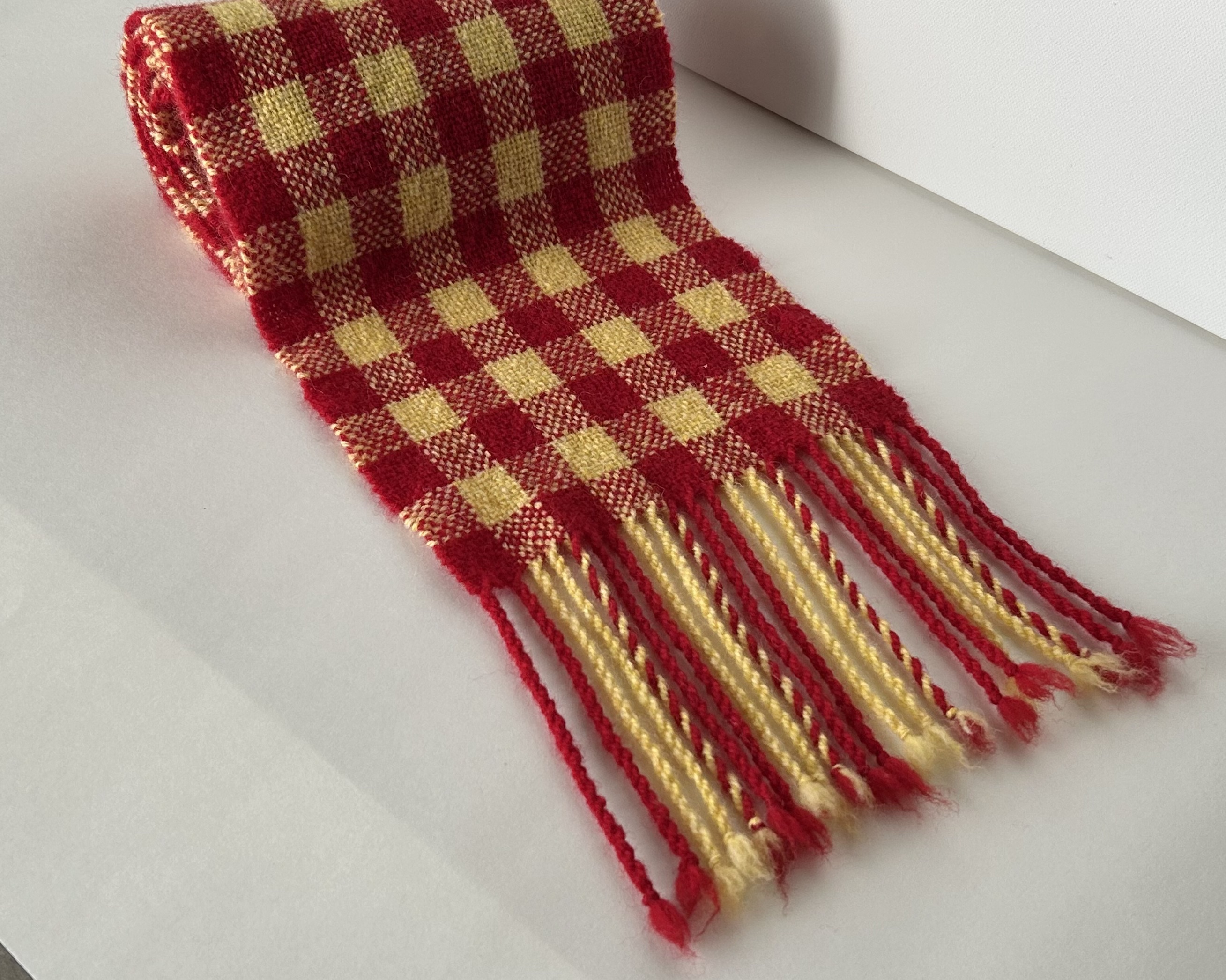 This extra long cozy scarf was envisioned for winter sports spectators and participants alike. Woven in a classic check pattern, let this bright red and yellow scarf declare your team loyalty.