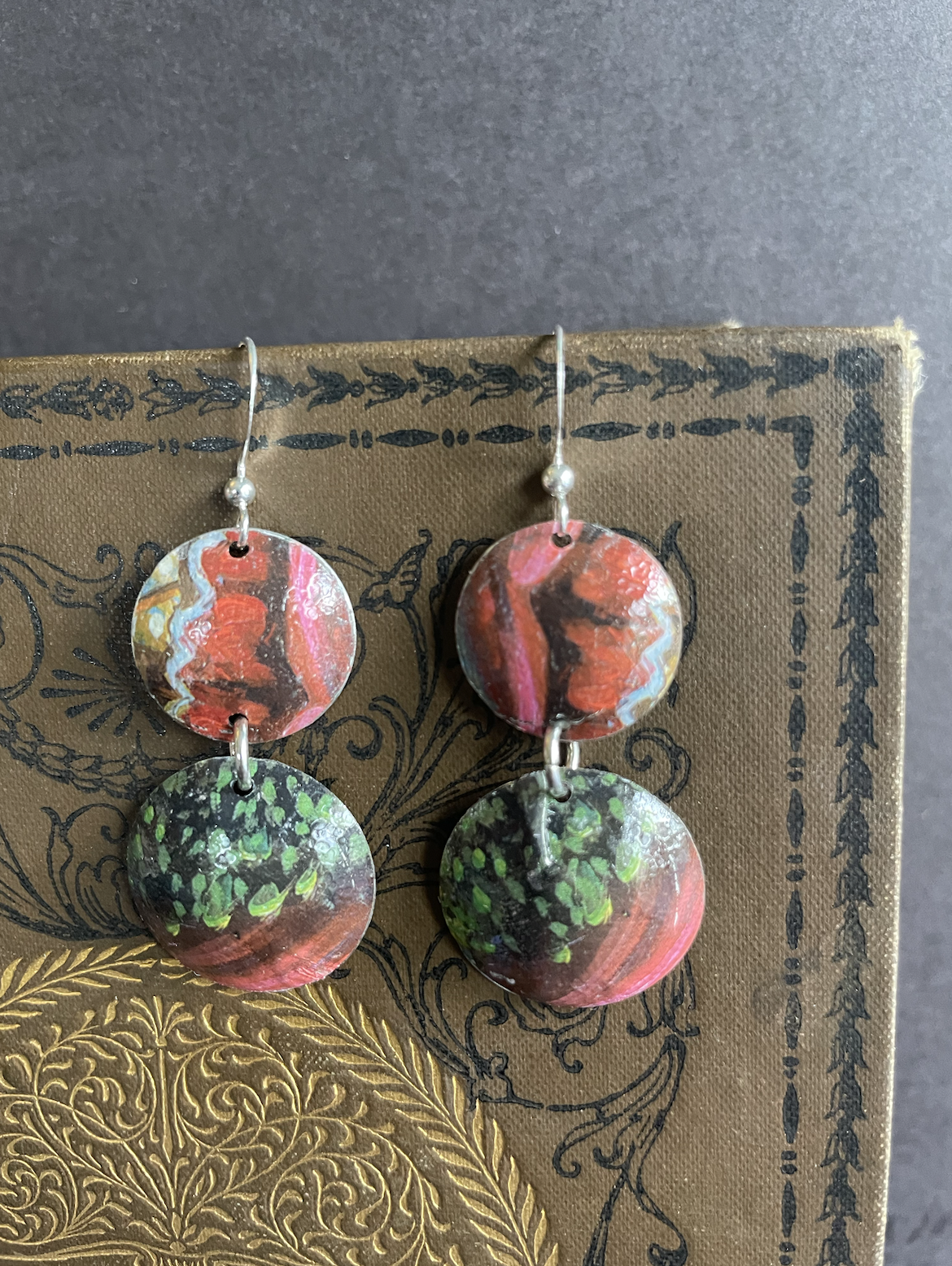 Tins are very light making them ideal for earrings as they don't weigh down your ears as the day goes on. Did you know the proper term for working with tin is "tinkering"? That made me really happy. I literally tinker in my art studio! I use old cookie tins, tea tins, and the like, break them down, and hand cut them into shapes and hand-hammer them into the 3-D shape I want them to be, finish and polish them, before putting them together like any other jewelry.