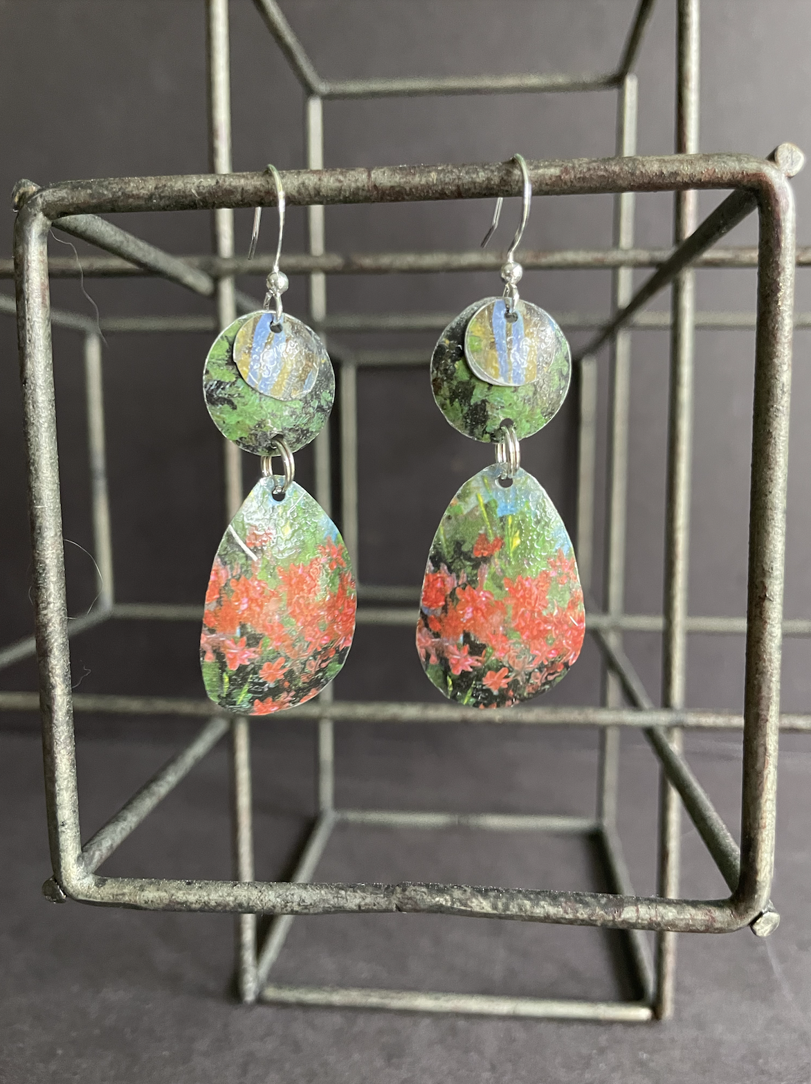 This popcorn tin showcased a quaint cafe and flower market scene in Paris. So quaint I named this collection "Gay Paris" (pronounced 'paree'). I love how the close-ups of so many of these bits create colorful abstract earrings, like these red begonia ones. These silver plated earrings come with a rubber stopper so they won't fall out of your ears.